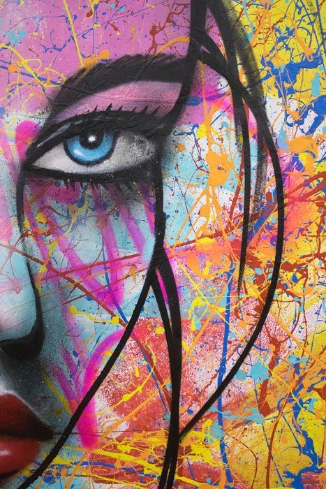 Ideal investment for companies and individuals. Big format painting Acrylic on canvas and spray paint Typical style of Nomen Size 140cm x 104cm The canvas comes with certificate of authenticity by "Nomen" Gallery price: 3000 View the artwork in our online gallery: https://assets.artplacer.com/virtual-exhibitions/?i=4952 Nomen aka Nuno Reis (1974) is a Graffiti / Street Art pioneer in Portugal, painting since 1989. He is an artist of high recognition and merit, in the Portuguese visual arts panorama being one of the oldest, and prestigious artists of Street Art in Portugal. Furthermore, Nomen's artwork was chosen and highlighted as essential for the beginning of street art in Portugal in the late 80's on the book Tráfego, Antologia Crítica da Nova Visualidade Portuguesa - Traffic, Critical Anthology of the New Portuguese Visuality published in 2001 by Porto 2001-European Capital of Culture . Nowadays, he is considered an international mural artist with enormous talent and extraordinary versatility, able to multiply himself in themes that range from his dancing letters of graffiti to captivating expressive and colorful female faces, to Pop and 3D themes, where it was portrayed in several magazines, websites, books and international publications that showed Nomen's artwork in during his career of 30 years of graffiti. In 2010, the book 3D Street Art, from Tectum Publishers, Belgium highlighted his work with 6 dedicated pages. This book introduces you to some of the most remarkable 25 artists from the past, present and future of 3D street art in the world along with artists like Roa, Blue Sky, Dan Witz, Edgar Mueller, Daim Nomen who is a versatile and prolific artist from an early age, he began to spread his art and mastery of Graffiti outside of Portugal, putting his name in graffiti letters, on walls and trains since the early 90s, in Spain, France, Switzerland , Holland, Germany and the rest of Europe.