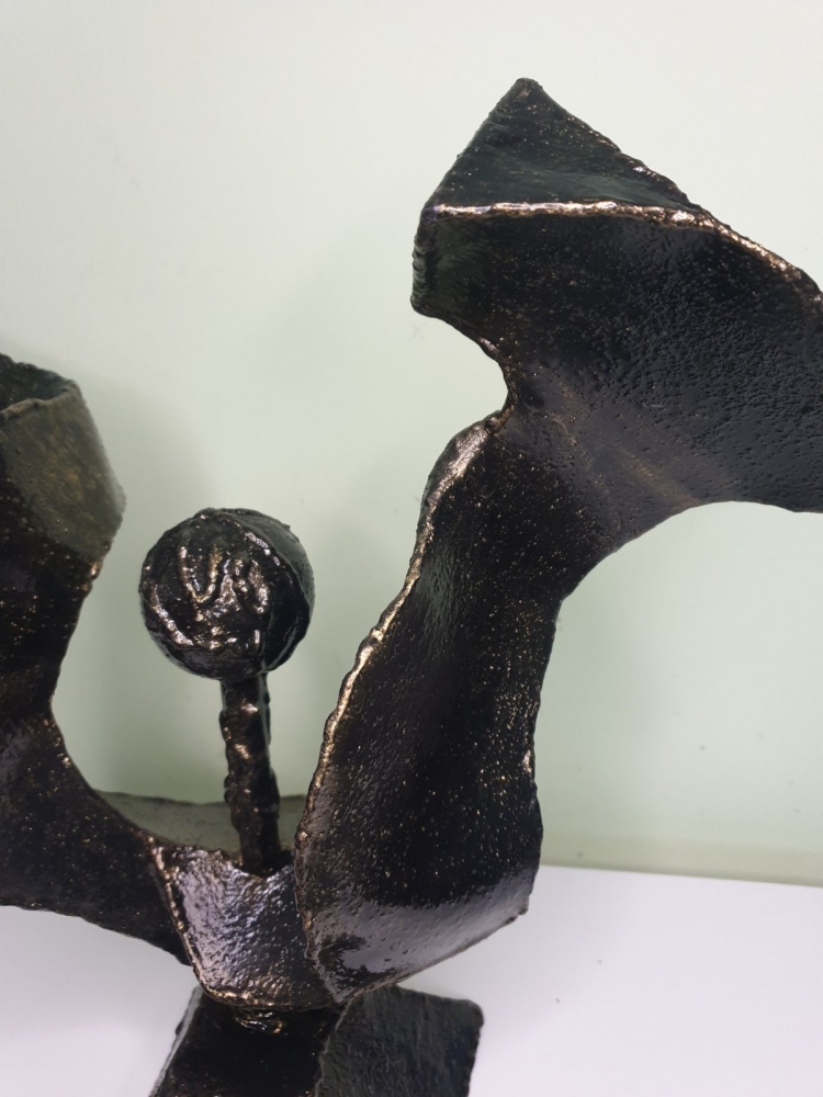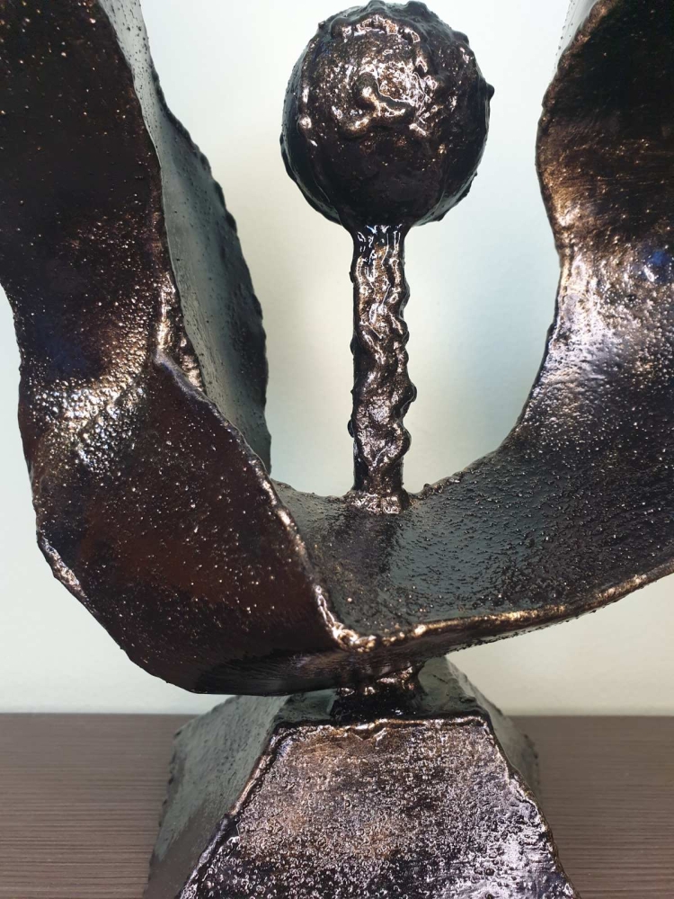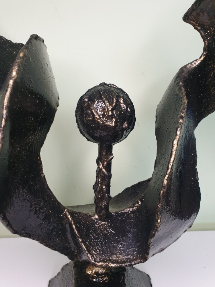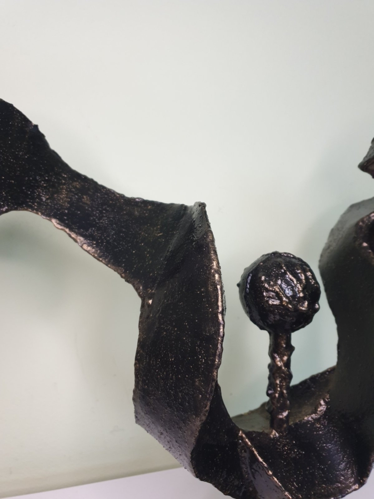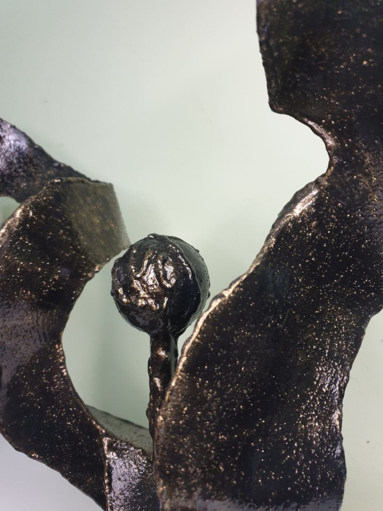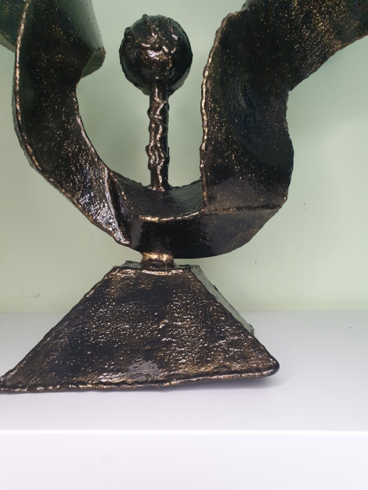 Wind, wind around a steel ball, plate 1mm welded in shape of the wind, sculpture from S-art studio. Unique welded and forged metal sculpture,it is not a casting. Material: carbon steel, color: black with golden wax, sprayed with transparent spray for protection. One of a kind work, comes with a certificate of authenticity. IMPORTANT NOTE: SHIPPING TO THE EU ONLY - NO SHIPPING TO NON-EU COUNTRIES.