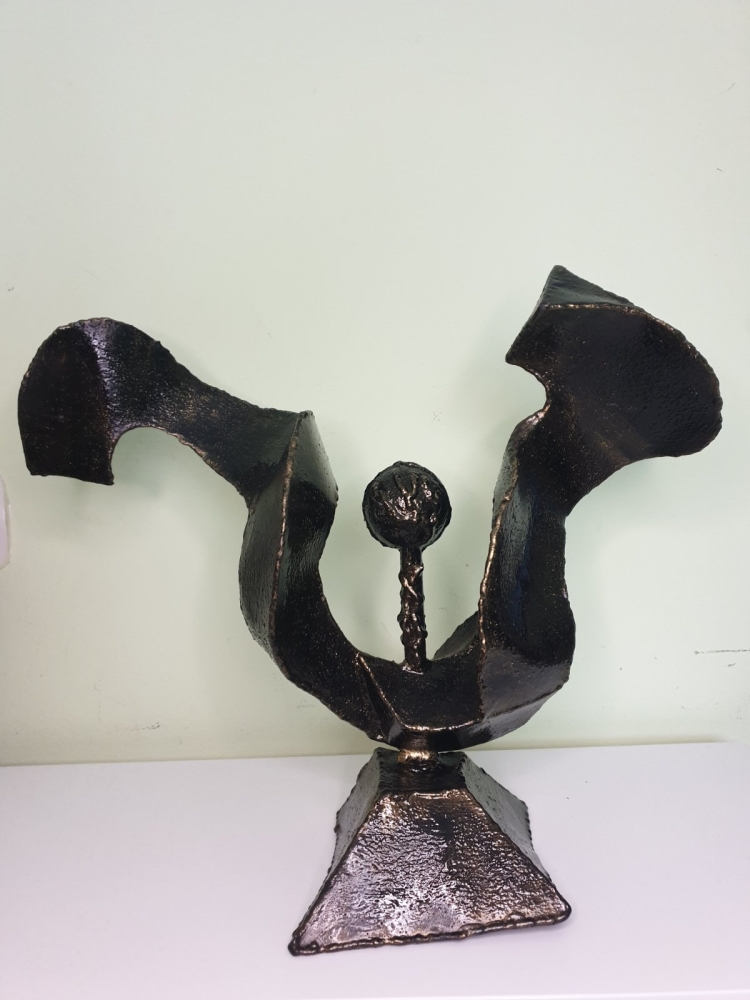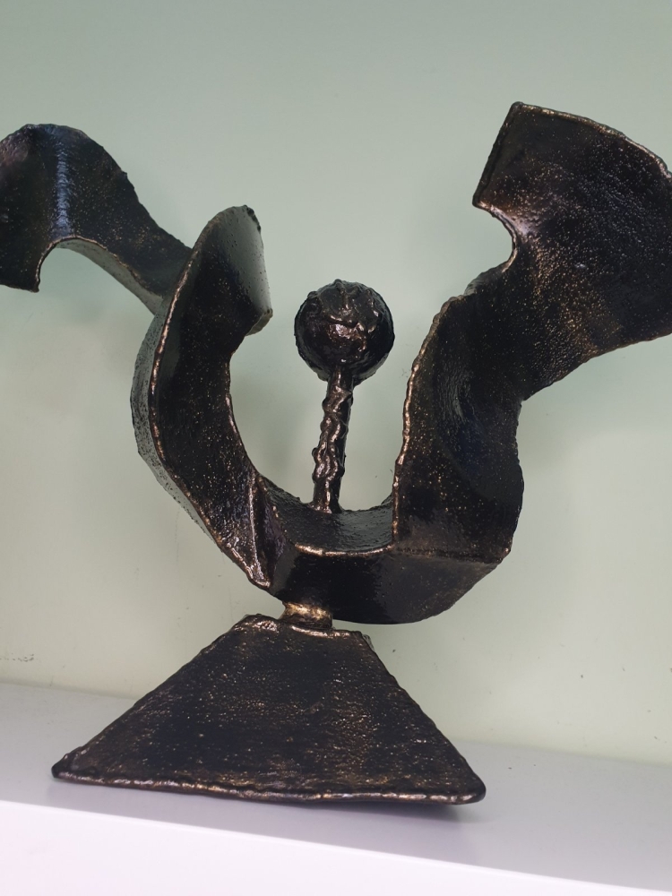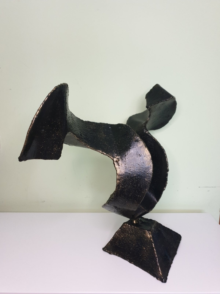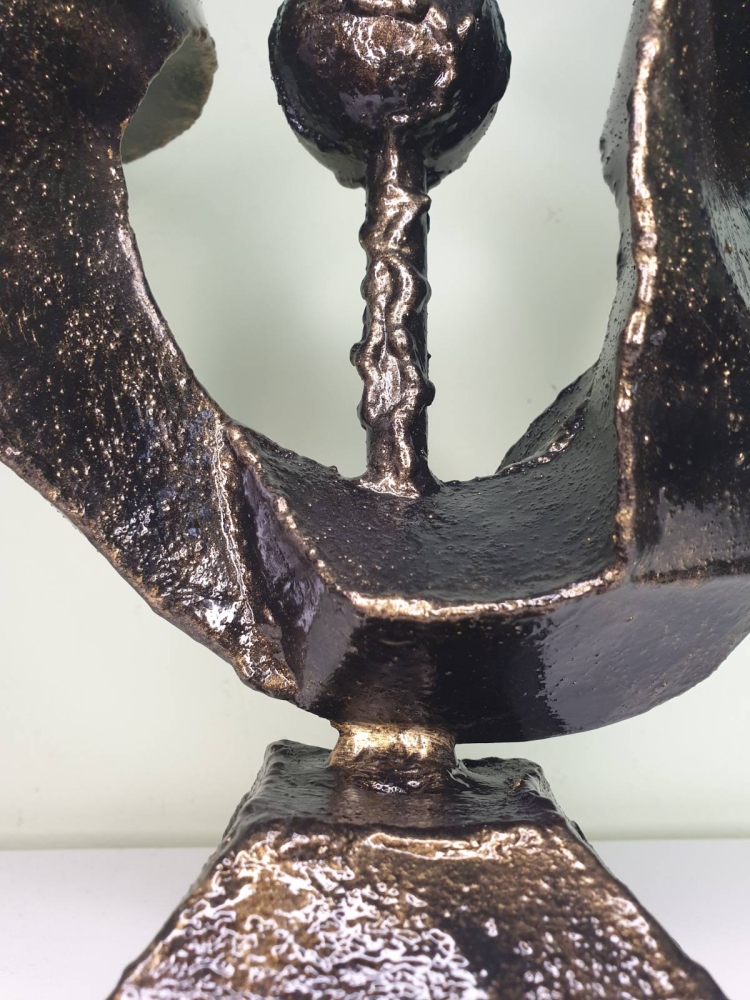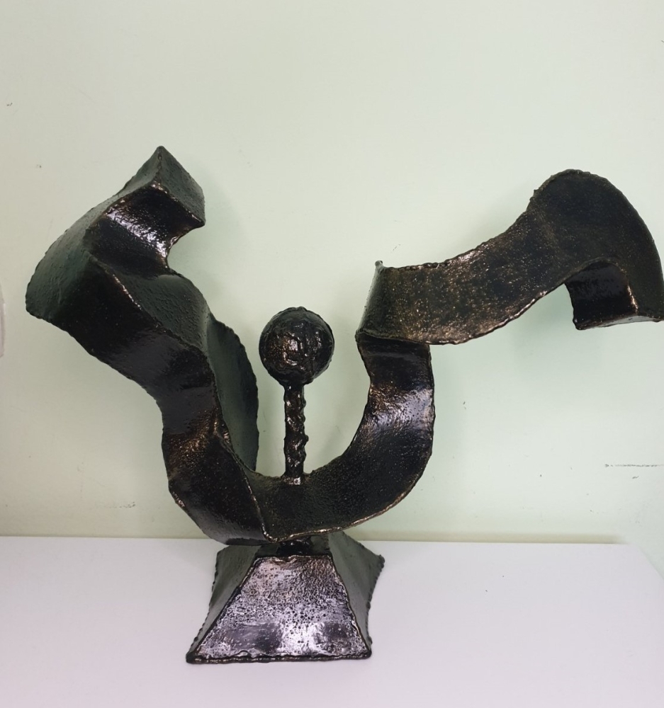 Wind, wind around a steel ball, plate 1mm welded in shape of the wind, sculpture from S-art studio. Unique welded and forged metal sculpture,it is not a casting. Material: carbon steel, color: black with golden wax, sprayed with transparent spray for protection. One of a kind work, comes with a certificate of authenticity. IMPORTANT NOTE: SHIPPING TO THE EU ONLY - NO SHIPPING TO NON-EU COUNTRIES.