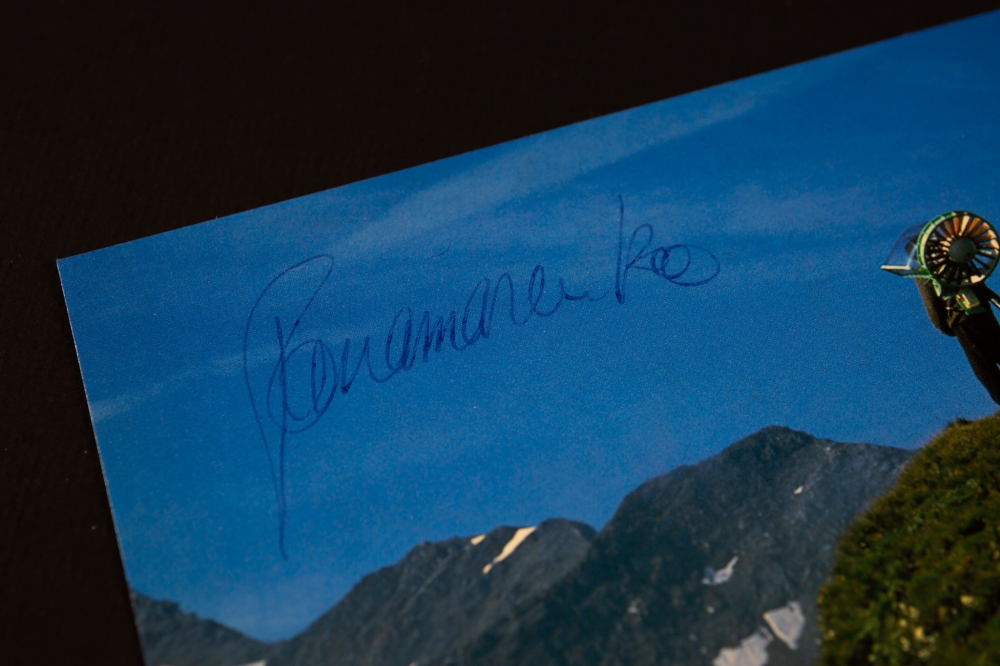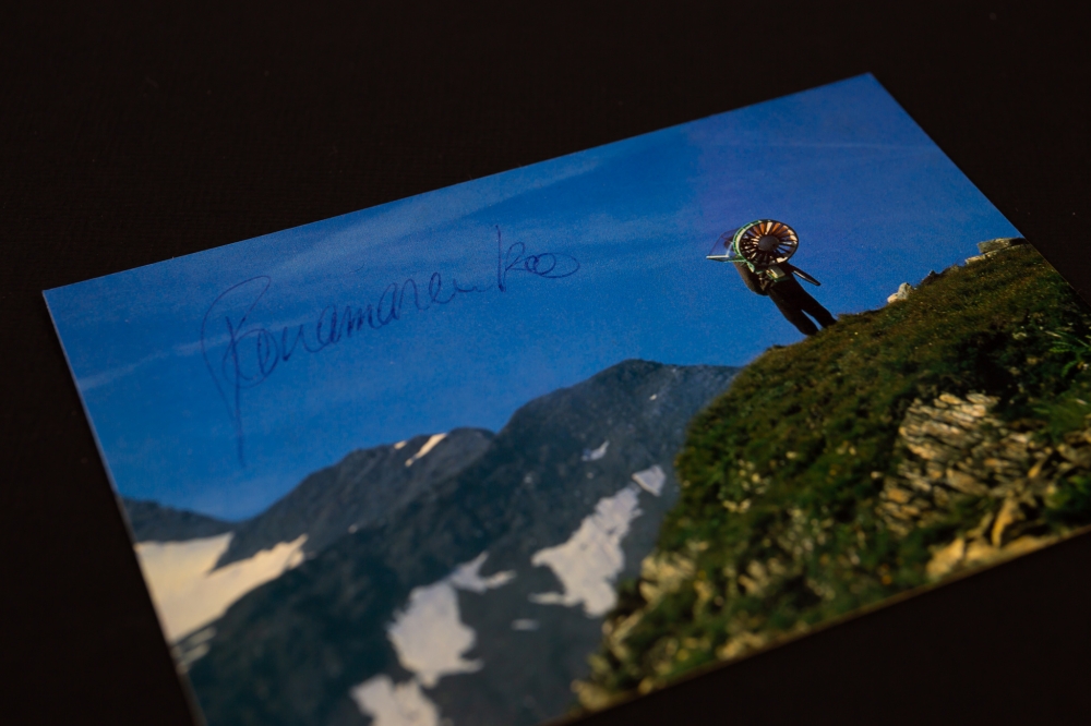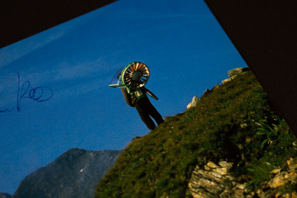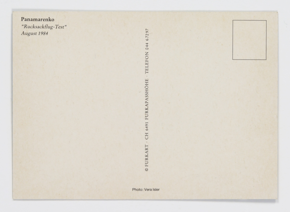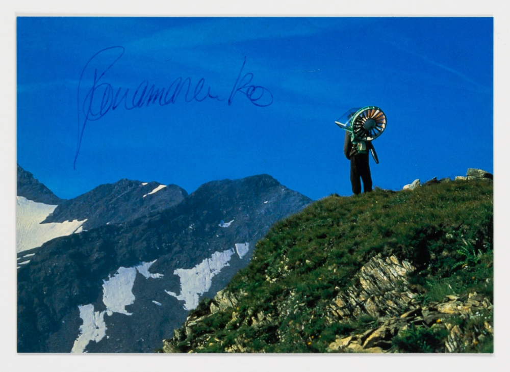 Hand-signed postcard entitled "Rucksackflug-Test" from his work "Groene Rugzak" from August 1984, a kind of flying backpack that he made, together with a "Silver Backpack" in his passage to the Furka pass in the Swiss alps.