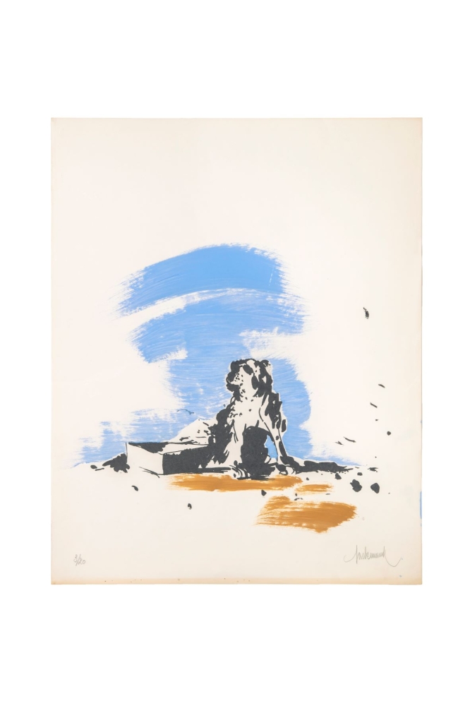 José Vermeersch zou dit jaar 100 geworden zijn. Deze verjaardag krijgt dit jaar bijzondere aandacht in de regio. We zijn dan ook blij dit werk in de veiling te mogen opnemen. 1937 Start teken- en schilderlessen aan de Academie in Kortrijk 1943 Studeert aan het Hoger Instituut Antwerpen (studies onderbroken wegens de oorlog – leeft ondergedoken in Westvleteren) 1945 Hervat zijn studies in Antwerpen 1951 Oprichter van de PVBA Firma Tegels (sierschouwen en open haarden) – schildert vooral portretten (om den brode) 1959 Lesgever decoratieschilderen aan het VTI Roeselare 1961 Verhuist met zijn vrouw en kinderen (Rik, Pol en Vera) naar Lendelede 1963 Bouwt een atelier met keramiekoven nabij z’n woning 1968-’69 Ontdekt een bevrijdende wijze van schilderen, verlaat het onderwijs en begint beelden in keramiek te maken 1979 Eerste veldoven in Reninge: 100 beelden 1985 Tweede veldoven in Lendelede: 35 grote beelden Tentoonstellingen in binnen- en buitenland: Rijsel, Brussel, Parijs, Keulen, Hamburg, Deurle, Rotterdam, Venetië, Haarlem, Mexico-City, Oostende, San Francisco, Amsterdam, Düsseldorf, Mulhouse… Over het werk: Hond Bijgeschilderde zeefdruk ‘Vanaf mijn jeugd heb ik de dingen rondom mij opgenomen en langs een plastische taal gepoogd te verbeelden. Het was een lange weg, vol horizonten en hindernissen, tot men uiteindelijk de brede klare horizont voor zich heeft, waar noch wet nog regel noch voorgaande je hindert. Ik noem het niet graag kunst, het is voor mij iets dat evenwicht zoekt in de maatschappij: sociale discipline en geestelijke vrijheid en dat wordt pas kunst in het museum, wanneer het zijn zegging verloren is, en reeds de volgende generatie het accent verlegt om beter. Zo zie ik mijn werk als een getuige van onze generatie die de banden van overdreven vormelijkheid doorbrak om meer menselijkheid.’ José Vermeersch (Opmerking:'foto in decor': de schaal van het werk kan afwijken van de realiteit.)