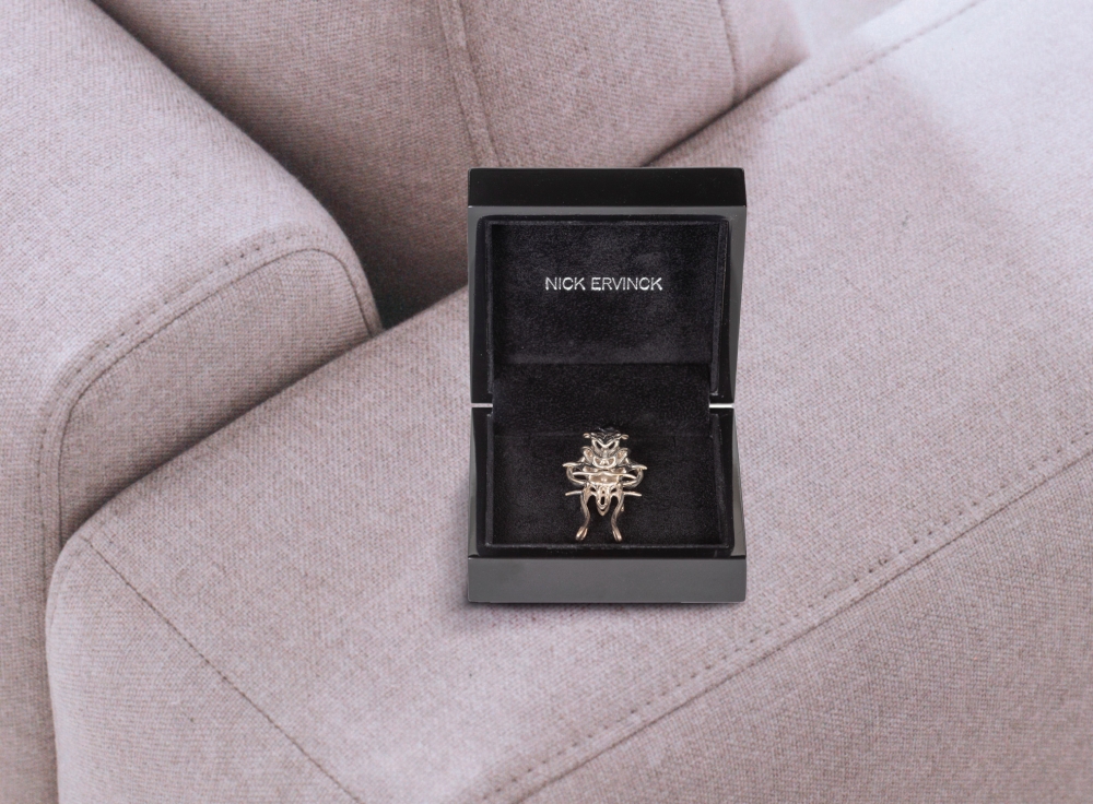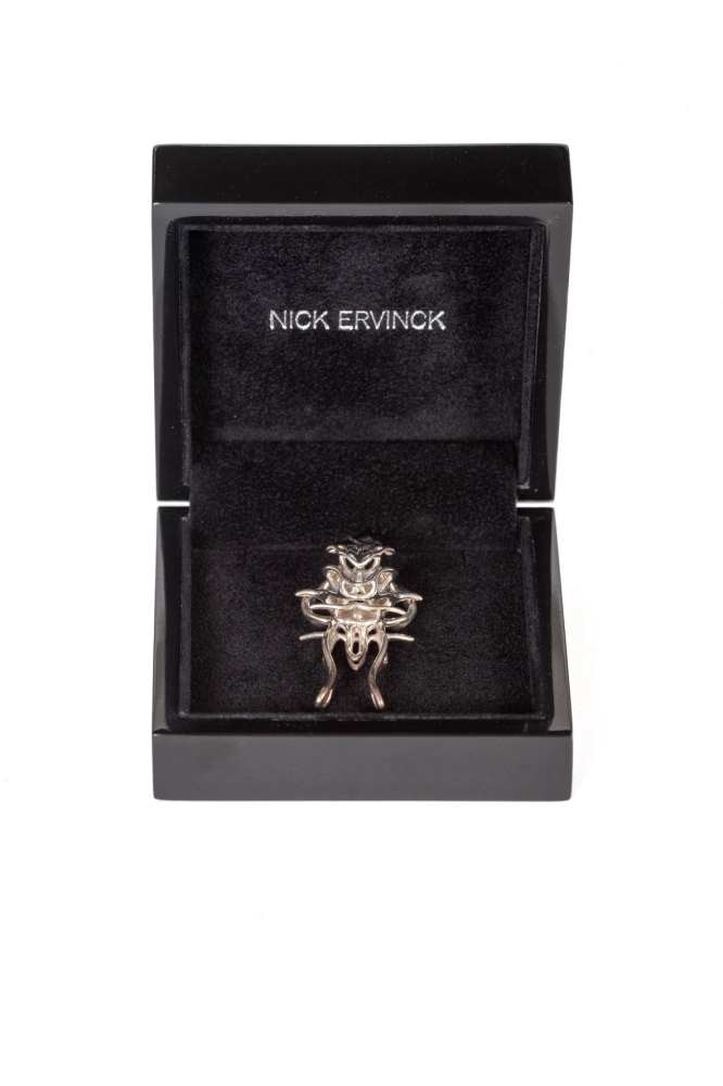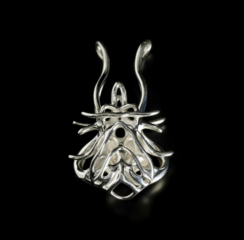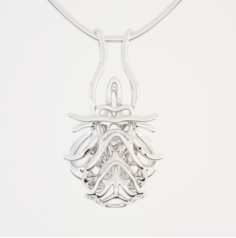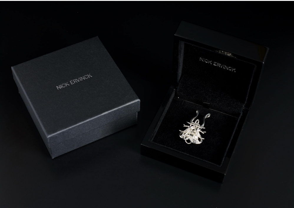 APUTO 24/35, 2015 AG 925 silver 5 x 2.9 x 1.6 cm 2 x 1.1 x .6 inches Signed delivered with certificate Packaging jewelry box, engraved with Nick Ervinck Includes necklace (various lengths) These detailed, 3D printed jewels are reminiscent to the blob-structures that are a central part of the oeuvre of Nick Ervinck. The organic, dynamic visual language is inspired by natural shapes and various other elements that can be found in the physical world, and are then transformed into a whole new design in the virtual world. The opposites organic fluid, virtual physical give a new dimension to the works, resulting in a dynamic, spontaneous and elegant design, as true mini-sculptures. While the flowing shapes of the jewellery is designed using 3D software techniques, they are translated back to the physical world by the use of 3D printing. Not only does Nick Ervinck use the newest digital techniques and technology to create his sculptures, the virtual logic is an inherent part of his designs. 3D technology and 3D printing has the incredible advantage to create the most complex structures and shapes. That way Nick Ervinck is able to renew the tradition of sculpture. Where Michelangelo still dealt with chopping away, chiselling or carving, the digital design process follows an opposite route: the virtual form is nod freed from the matter, but becomes a productive or generative principle in itself. This interaction between tradition and innovation is a central part of the oeuvre of Nick Ervinck. (Note: 'photo in decor': the scale of the work may differ from reality.)