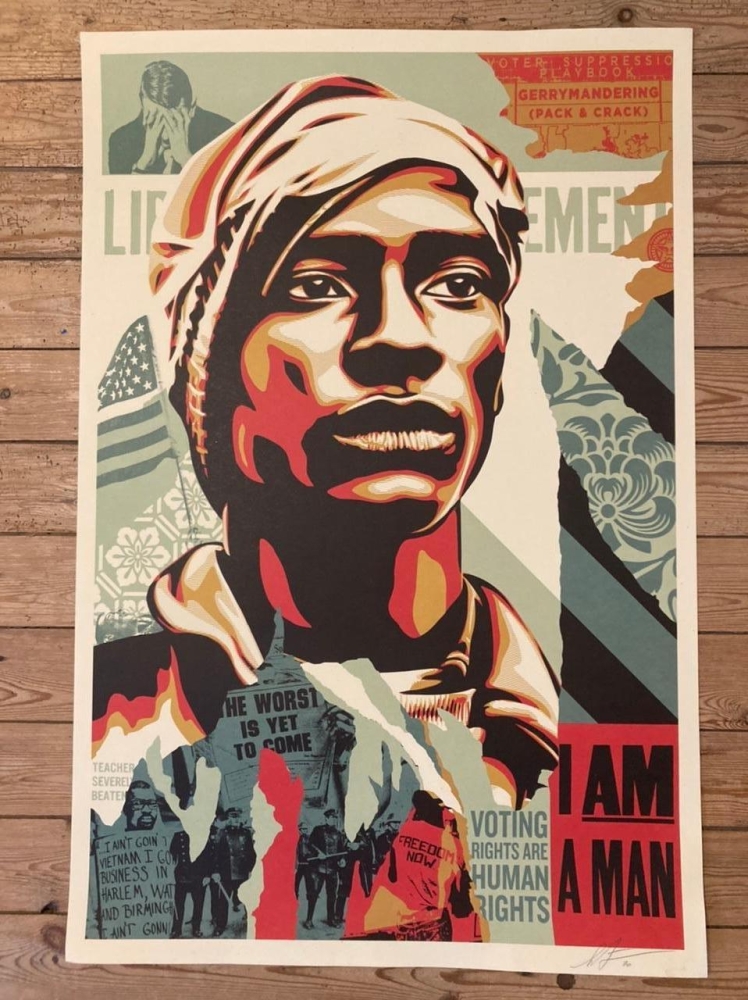 This offset print is printed on cream speckletone paper and is signed and dated by Frank Shepard Fairey. He became known worldwide during the 2008 US presidential election for his poster "Hope" of Barack Obama. This is a collaboration with photographer steve schapiro.