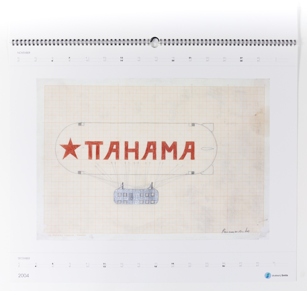 The calendar contains 6 drawings of Panamarenko: Modern magnetic spaceship, Submarine 2nd phase, Pepto Bismo II, Aragna, Flying Jungle, and Mountain Machine and Panama in a high-quality print.