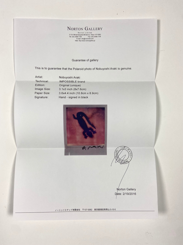 Polaroid - Signed - 2016 Artist: Nobuyoshi Araki (1940-) Technique: Polaroid Signature: Signed Condition: Very fine Image size: 8×7.6 cm Total dimensions: 10.8×8.9 cm (4 3/10 × 3 1/2 in) Signed on the front in black by Nobuyoshi Araki. A unique color polaroids. With COA's by Norton gallery, Tokyo, stamped and dated. Nobuyoshi Araki is a prolific photographer who has produced thousands of photographs over the course of his career. He became famous for Un Voyage Sentimental (1971), a series of photos depicting both banal and deeply intimate scenes of his wife during their honeymoon. A number of his works feature young women in sexualized situations: Kinbaku, a series from 1979, features 101 photographs of women in rope bondage. He typically works in black-and-white photography, and his hallmark style is deliberately casual. Rather than shooting something that looks like a professional photograph, I want my work to feel intimate, like someone in the subjects inner circle shot them, he says.