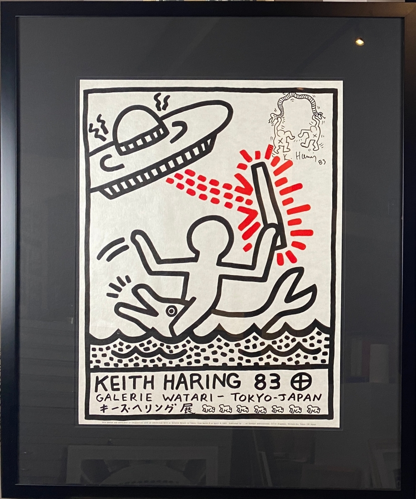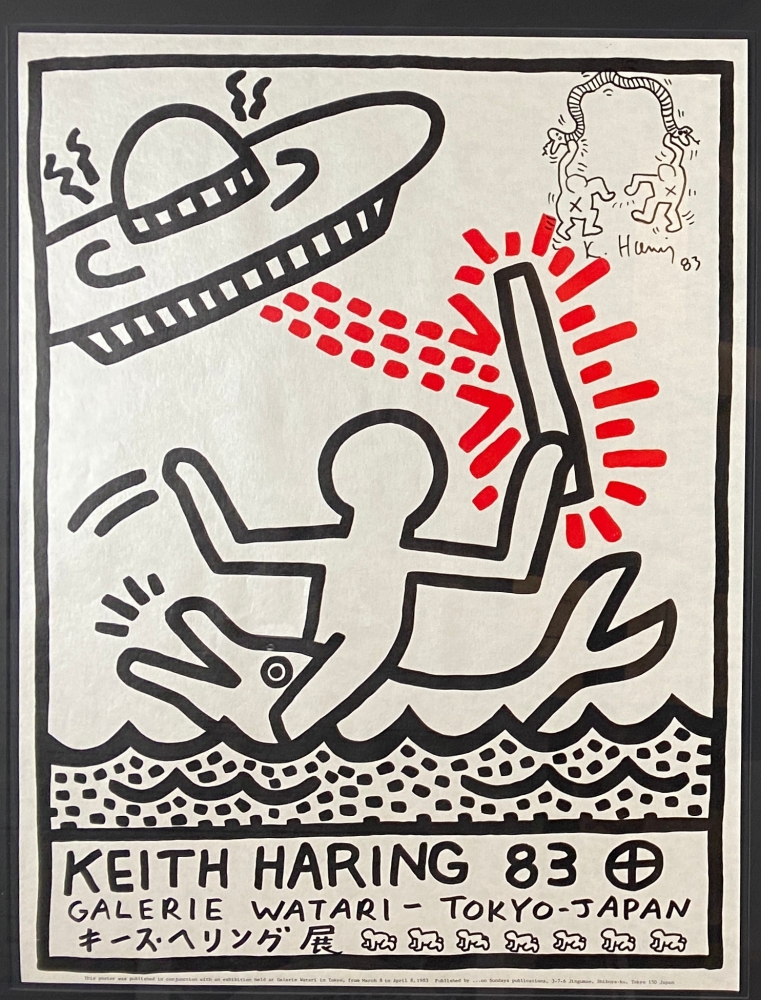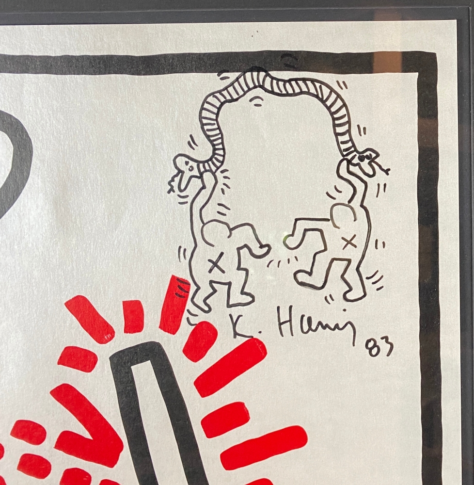Beautiful rare exhibition poster for the exhibition in Tokyo at Galerie Watari in 1983. Keith Haring made an original drawing for this poster. The poster was also signed and dated. This work was professionally framed.