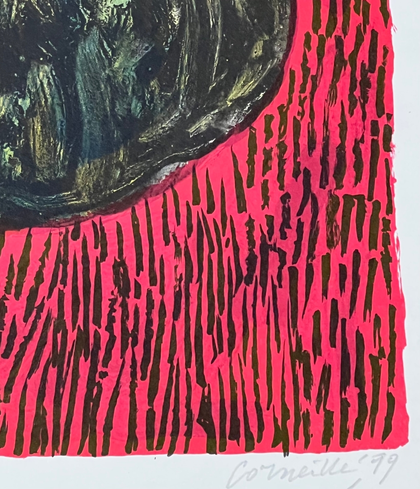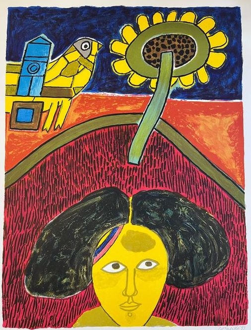 We are celebrating this year the 100th anniversary of the birth of Corneille (1922-2010)! In the 1990s, Guillaume Corneille set up his studio in the middle of his garden facing the wheat fields painted by Van Gogh. Superb large format original lithograph by the painter Guillaume Corneille, born in Liège to Dutch parents, founding member of the Cobra movement, with Karel Appel, Asger Jorn, Constant, Dotremont and Joseph Noiret. Dimensions: 76 x 56cm. The quality of the lithography is such that it gives the impression of having the brushstrokes in front of you. Signed and dated in pencil by the artist Numbered 64/75 "The sunflower" With this lithograph, Corneille pays homage to Vincent van Gogh's sunflowers. So many flowers, a thousand and a thousand suns, torrent of sunflowers, huge solar honey pour between the breasts of the green hills. Yellow, Yellow, Van Gogh Yellow Color that only he knew so magnify. » CROW In a perfect state Secure shipping with UPS