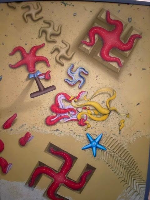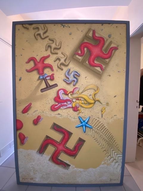 Beautiful large oil painting on panel Nice color palette. Bold compositions, typical of this well-known artist. Complementary colours, e.g. yellow banana peel vs. blue wind-up toy star. Unique work! Especially for this big one! The frame is not in the best condition but the work can be mounted on the wall. The work itself is in beautiful condition