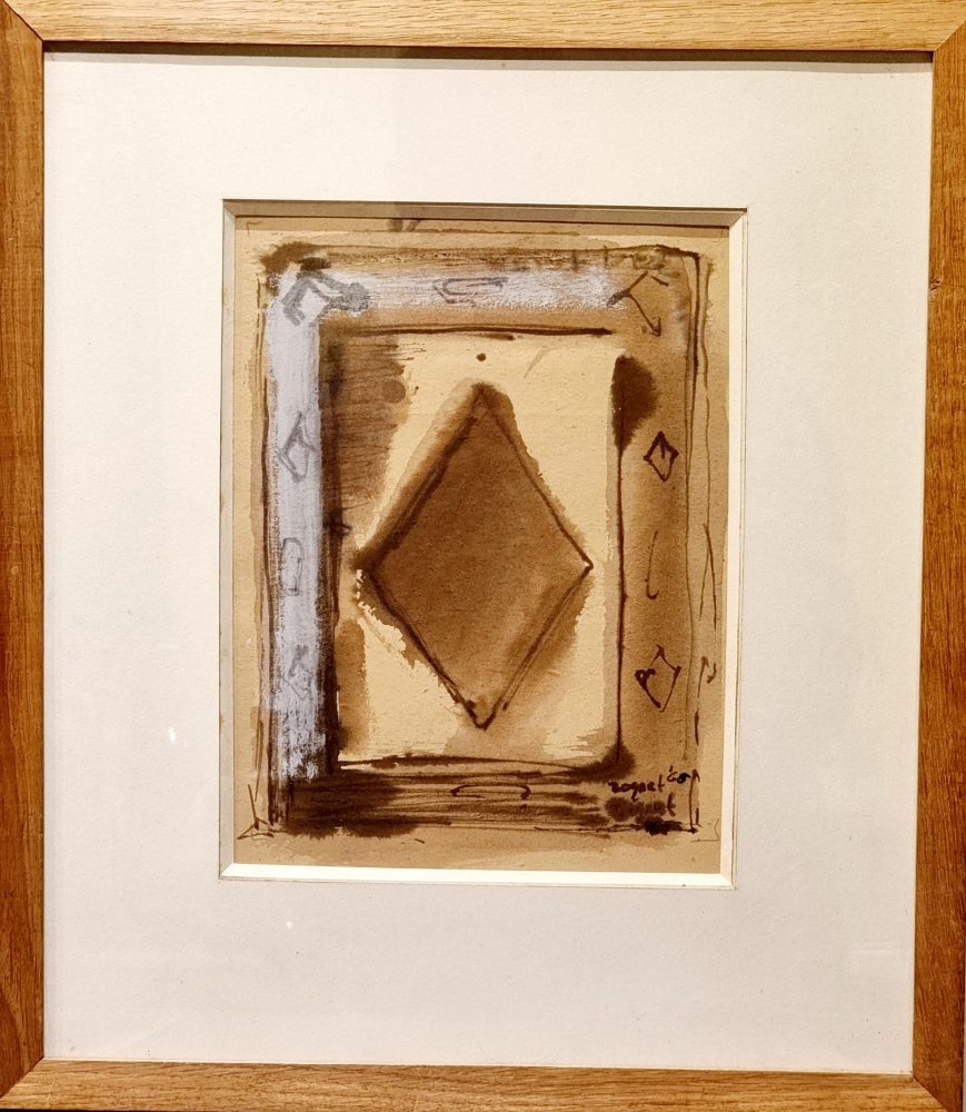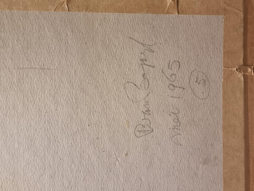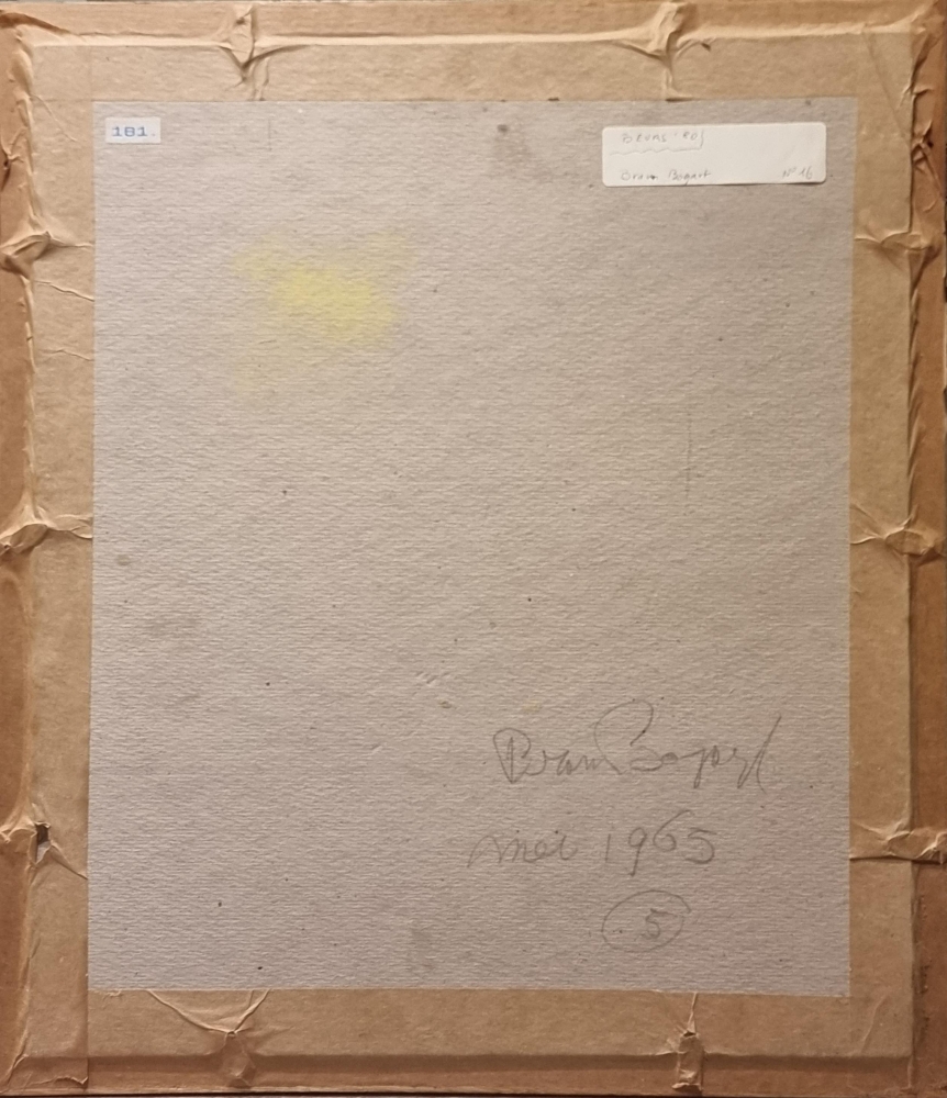 Prachtig origineel & uniek werk van Bram Bogart uit 1965. Techniek: Aquarel - Lavis Gesigneerd recto: "Bogart 65" Gesigneerd verso:"Bram Bogart - mei 1965" Hier komen de typische figuren die Bram Bogart kenmerken voor het eerst op de voorgrond (ruit - vierkant) Het werk is ingelijst in een (oude) houten lijst.