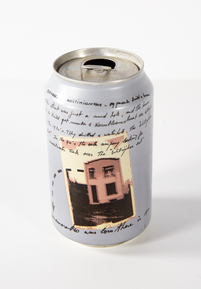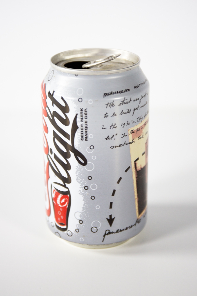 Cola light blikje (leeg) met een foto van het geboortehuis van Panamarenko (°1940) in de Koornbloemstraat nr 1 te Wilrijk. Uit een reeks van 4 blikjes met verdere bijdrages van Wim Delvoye, Jacques Charlier en Patrick Corillon.