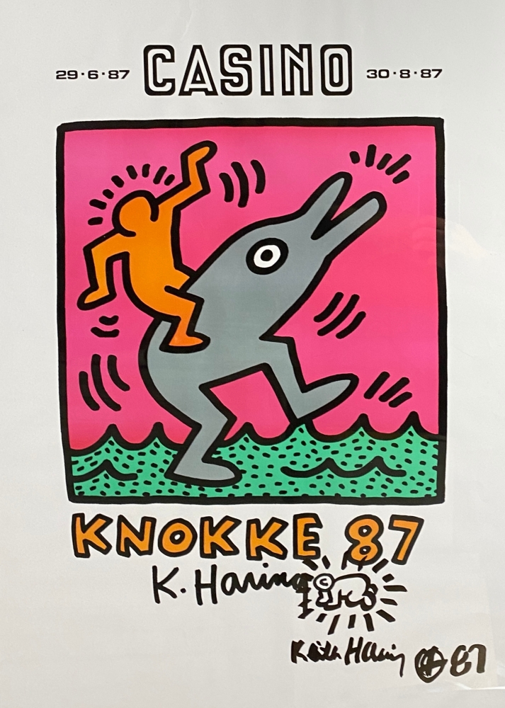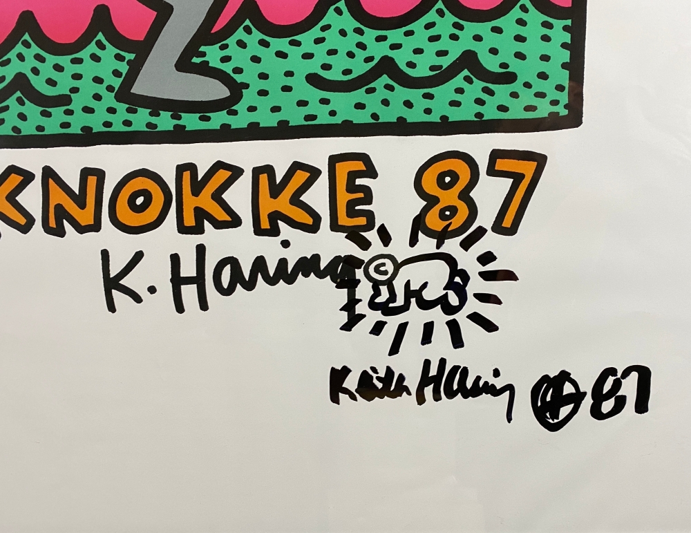 Beautiful poster for the exhibition of Keith Haring in Knokke, 1987. Keith Haring made a drawing of the famous 'crawling baby' on this poster. The poster was also signed and dated by the artist. The artwork is professionally framed.