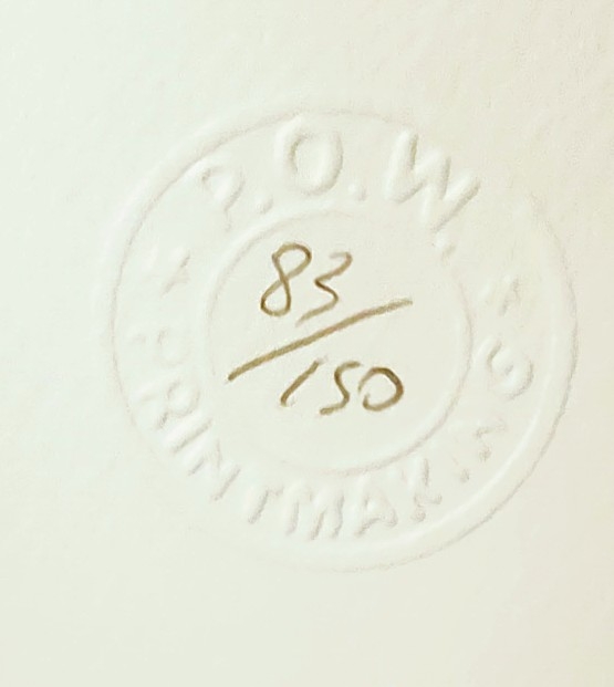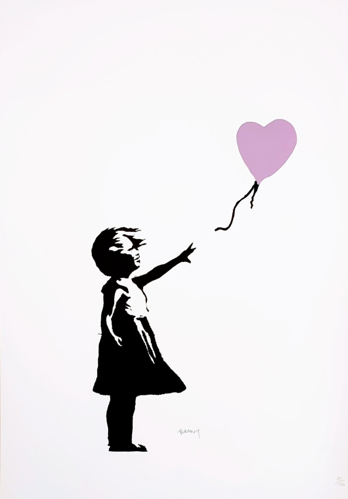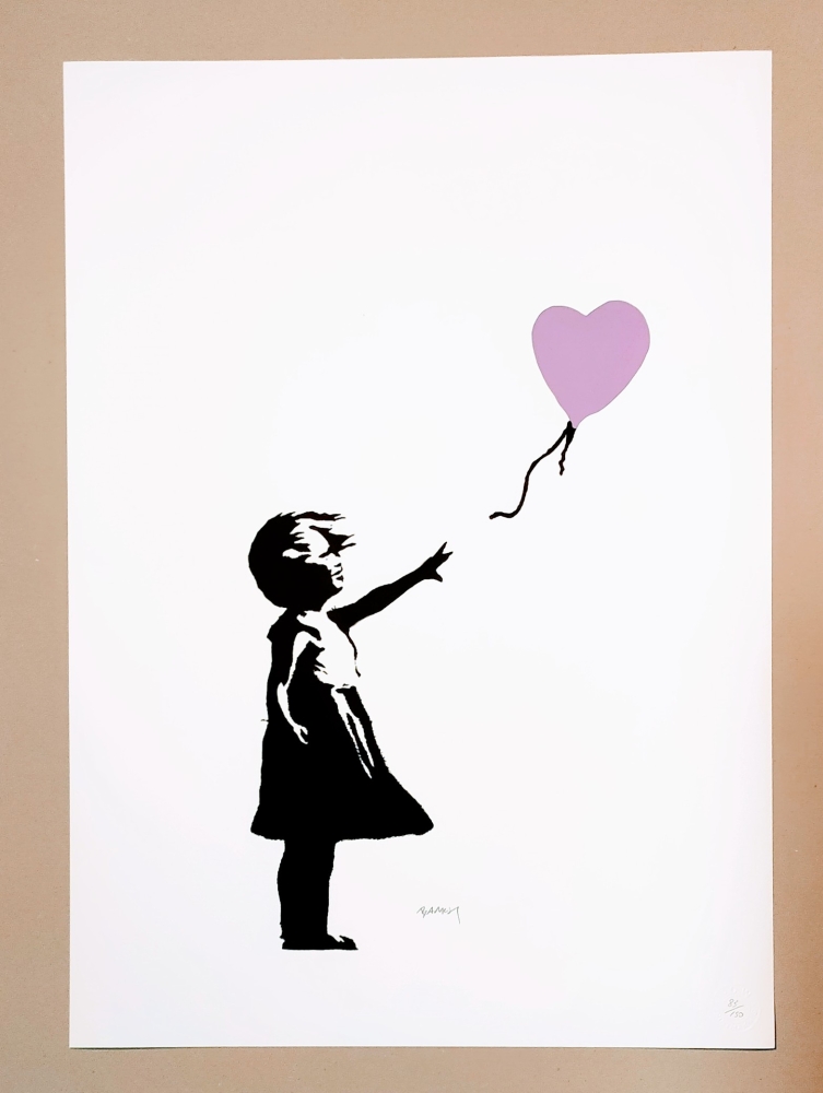 Lithografie meisje met paarse ballon naar het origineel uit 2000 Gesigneerde en gelimiteerde editie 83/150. Afmetingen van de litho: 50*70 cm Reliëfstempel van P.O.W. Reliëfstempel van Banksy (Rocket Elephant).