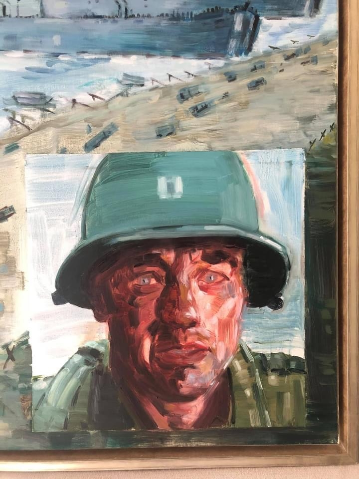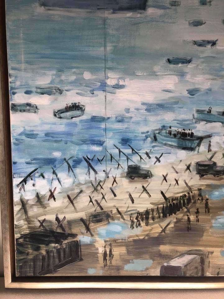 Painting with custom frame. The total size is 165cm x 105cm. Painted by Jerry Mangelschots. The scene painted is an image from the movie 'Saving Private Ryan' (The Normandy Landings) featuring Tom Hanks. Painted in the year 2015. Unique example: normally no scenes from movies! Perfect in a modern interior or lovers of the WWII (World War II) or in a children's room. Auction prices fluctuate between 2000 - 4000 euros from this artist.