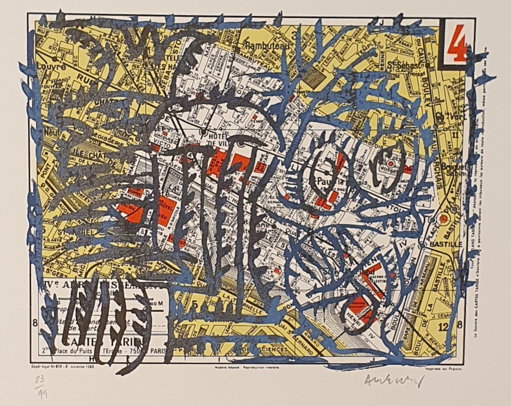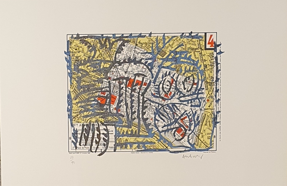 Beautiful color lithograph by the Belgian artist Pierre Alechinsky The work is one of 21 lithographs from the portfolio Arrondissements from 1983. The work is signed and numbered 83/99. The work is in good condition and is not framed.