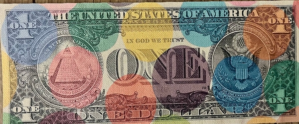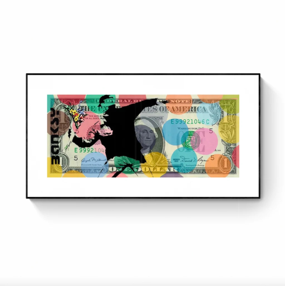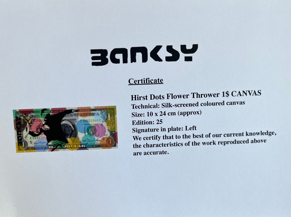 Banksy est un des artistes street art les plus cotés au monde BANKSY Hirst Dots Haring Dog 1$ CANVAS Technical: Original silk-screen canvas Signature: Left Size: 10 x 24 cm (approx) Edition: 25 Comes with COA Unframed