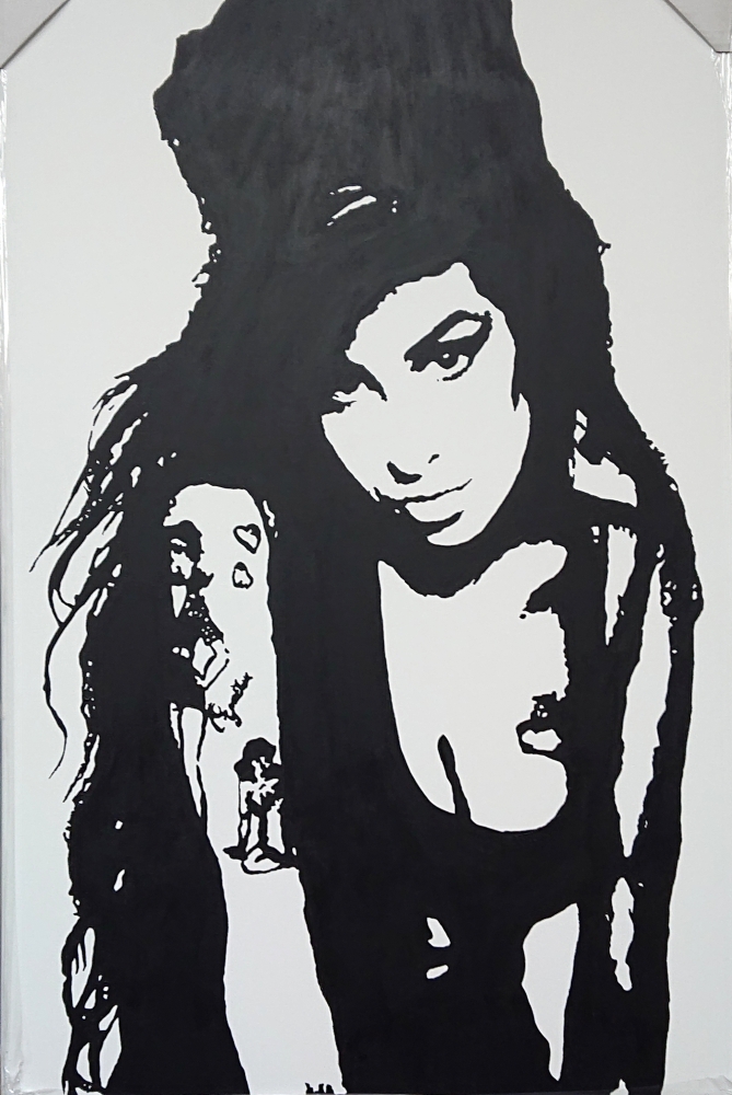 GERKE RIENKS , heeft gekozen om bekende mensen uit kunst en muziek in zwart en wit uit te drukken , soms ook met kleur of andere nieuwe technieken , wat blijft zijn de heel aparte onderwerpen , hier amy winehouse ons allerbeste underground zangeres , die naar hotel Californië is gegaan , hier een ode aan haar