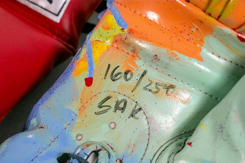 Set of boxing gloves launched on the occasion of Muhammad Ali's Olympic victory in 1960. This set is even more special, as it is uniquely painted by Steve Kaufman and screen printed with Muhammad Ali's likeness. In addition, all personalized gloves are also signed by Steve Kaufman (on the back "SAK") and by Muhammad Ali. This edition was created shortly after 1960, and was limited to 250 regular and 250 deluxe copies. This is a deluxe copy. See also Steve Kaufman's website. The left glove lists the matches and victories of Muhammad Ali, alias Cassius Clay during the 1960 Olympics.
