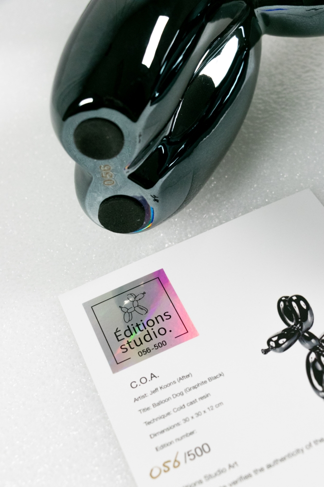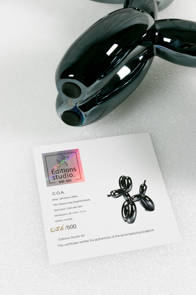 Resin sculpture after Jeff Koons, published by Éditions Studio. Edition limited to 500 pieces, of which this number is 53. The sculpture comes with the original packaging and is accompanied by the original certificate. Sculpture is in good to excellent condition.