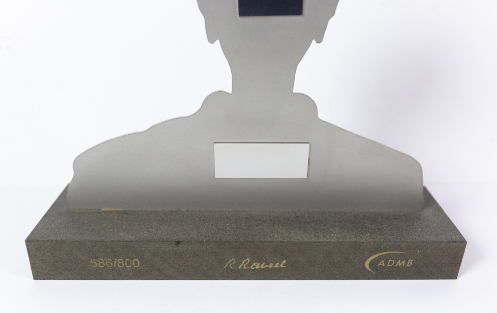 Sculptuur gemaakt met metaal. Werd uitgebracht op 800 exemplaren naar aanleiding van het 75 jarige bestaan van ADMB, Brugge. Signatuur en nummering aan de voorzijde van de sokkel. Werk is in goede tot uitstekende staat.