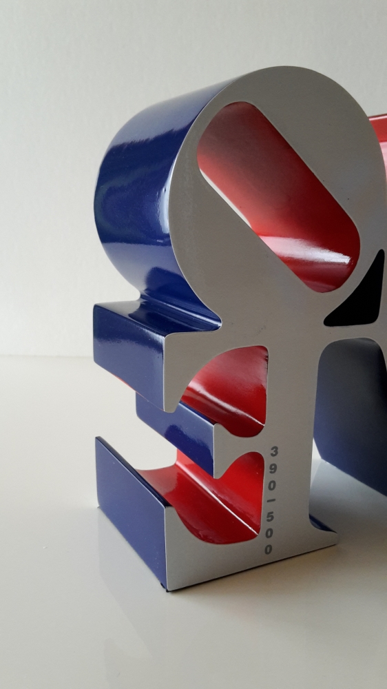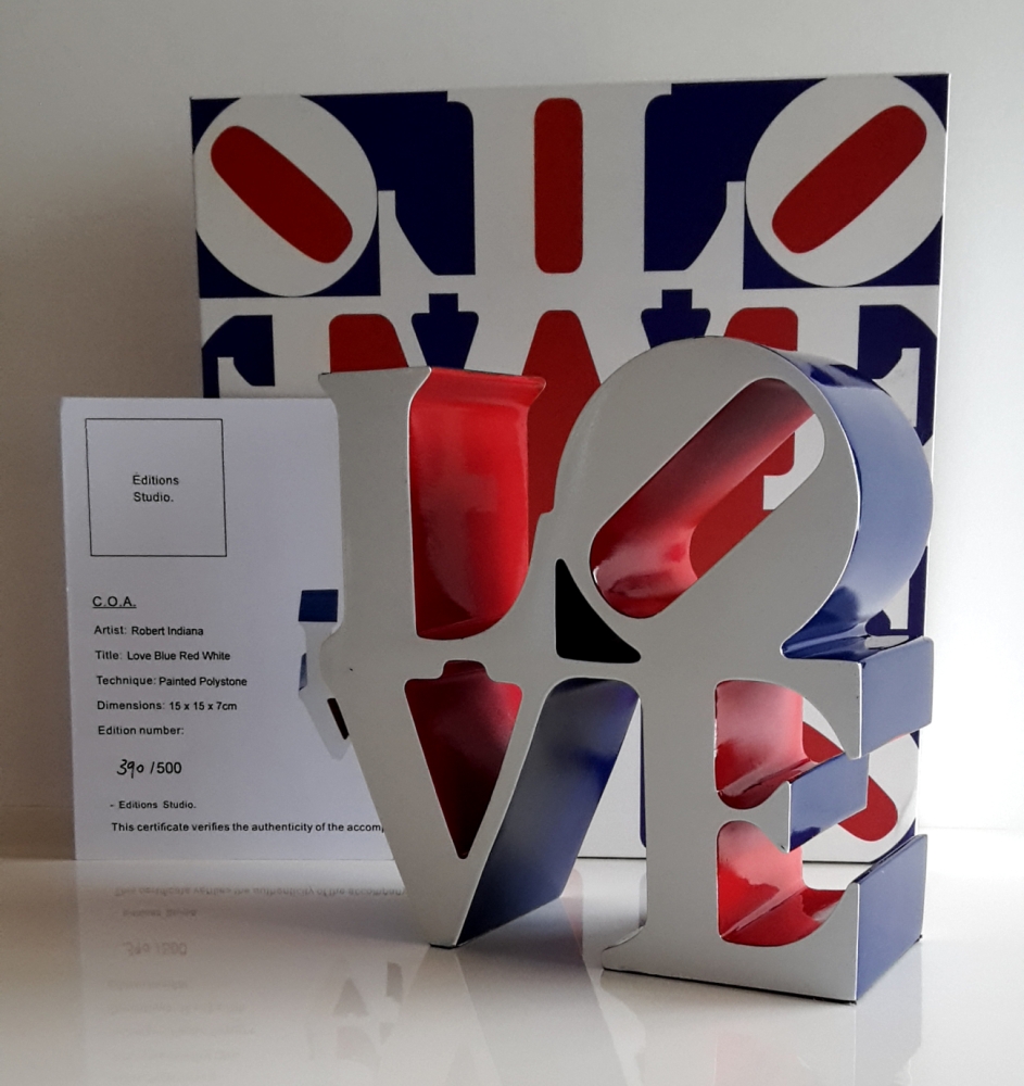 Resin sculpture released by Editions studio of Robert Indiana's "Love" sculpture. Limited to 500 ex. of which this is no. 390. Comes with certificate in the original box. Love is a pop art image by American artist Robert Indiana. It consists of the letters L and O over the letters V and E in bold Didone type; the O is slanted sideways so that its oblong negative space creates a line leading to the V.