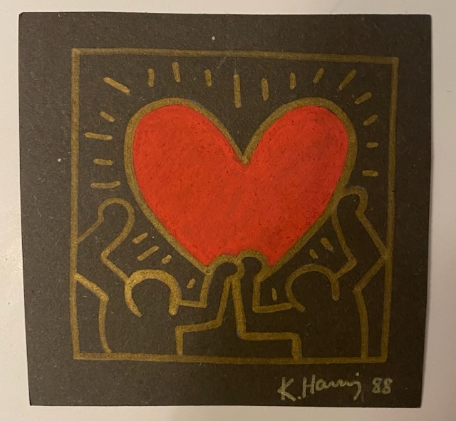 Beautiful original work by Keith Haring. On cardboard paper. Signed with a gold marker and red colored heart. The work measures 12.5 by 12.5 and is signed and dated on the front. 1988 Perfect condition.