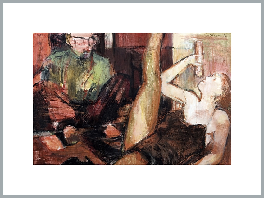 Dit werk is een gemengde techniek van pastelkrijt en verf op papier. Ingelijst in een hoge kwaliteit aluminium lijst achter glas. afmeting lijst: 90 x 120 cm. afmeting beeld ca 60 x 90 cm. Het onderwerp is een still van een nachtclub zangeres in een sensuele pose en iemand uit haar publiek . Het werk is op een aantal exposities geëxposeerd geweest en heeft altijd positieve aandacht gekregen. Lambert Oostrum is nog steeds actief als beeldend kunstenaar. In het begin van zijn loopbaan heeft hij in 1987 de Alfons Blomme prijs gewonnen. Recent werkt Lambert meer abstract met af en toe wat figuratie. In 2018 is hij genomineerd voor de Herman Krikhaarprijs in Almelo . Het schilderij van de nominatie heet: Fresh Product Het een en ander is te lezen op zijn website: www.lambertoostrum.nl