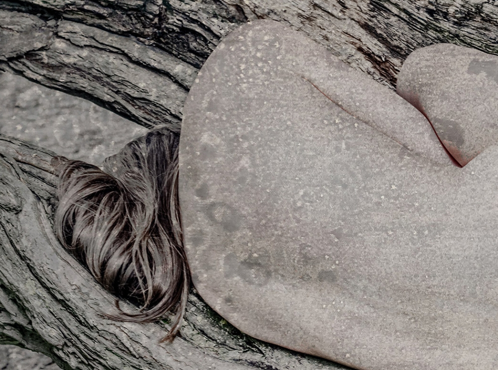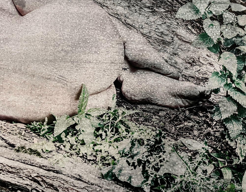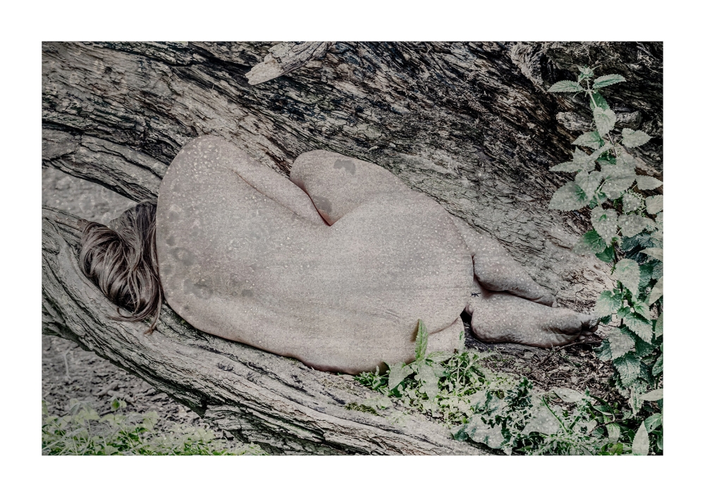 A naked young woman who, like a chameleon in a fetal position, becomes one with the tree. The work is a digitally edited photo printed on Hahnemühle Photo Rag Ultra Smooth 305grm. It is also possible to buy an edition print with frame. Price for this is on request. Sizes 60 x 85 cm