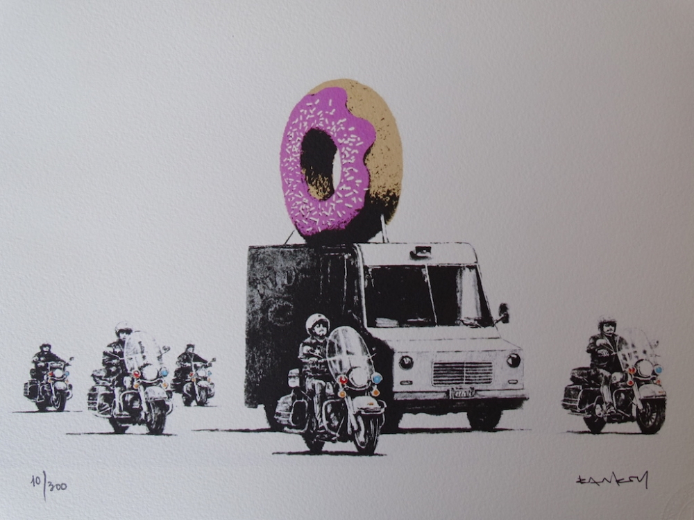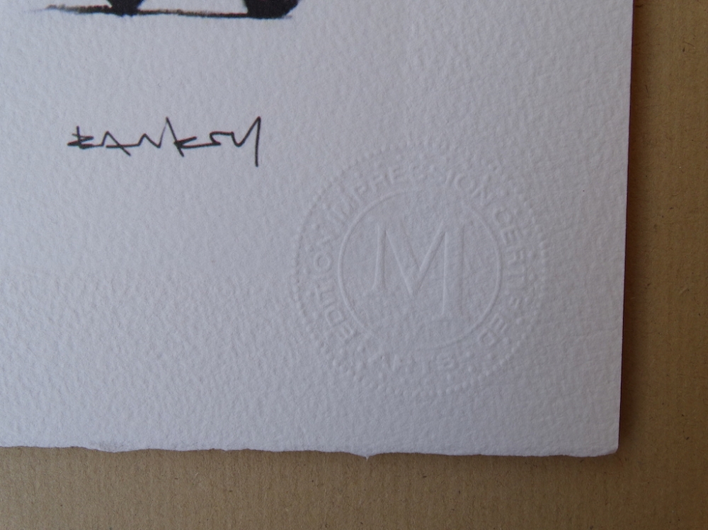 Banksy. Limited edition print reproduction, 38x28cm, Certificate of Authenticity by Certified Arts Edition Impression Ars Longa Vita Brevis Banksy is a pseudonymous England-based street artist, political activist and film director whose real name and identity remain unconfirmed and the subject of speculation. Active since the 1990s, his satirical street art and subversive epigrams combine dark humour with graffiti executed in a distinctive stenciling technique. His works of political and social commentary have appeared on streets, walls and bridges throughout the world. Banksy's work grew out of the Bristol underground scene, which involved collaborations between artists and musicians.Banksy says that he was inspired by 3D, a graffiti artist and founding member of the musical group Massive Attack. Banksy displays his art on publicly visible surfaces such as walls and self-built physical prop pieces. Banksy no longer sells photographs or reproductions of his street graffiti, but his public "installations" are regularly resold, often even by removing the wall they were painted on.Much of his work can be classified as temporary art. A small number of Banksy's works are officially, non-publicly, sold through an agency created by Banksy named Pest Control. Banksy's documentary film Exit Through the Gift Shop (2010) made its debut at the 2010 Sundance Film Festival.In January 2011, he was nominated for the Academy Award for Best Documentary Feature for the film. In 2014, he was awarded Person of the Year at the 2014 Webby Awards.