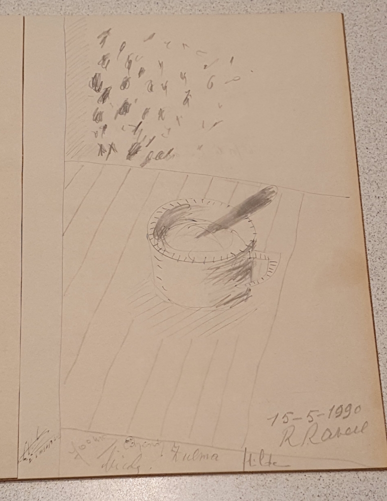 Original pencil drawing by the Belgian artist Roger Raveel. This drawing comes from the guestbook of restaurant Lusitania (Oostende). The restaurant still exists and is located near the pilotage where the artist also made some murals. The drawing is dated 15/05/1990. This is the week after the artist walked around Brussels with his work 'The sense of the meaningless'. The drawing is signed by the artist but also (among others) by Zulma, Roland Jooris, Octave Scheire. The authenticity of the drawing was confirmed by the latter. The work was framed behind UV-resistant glass.