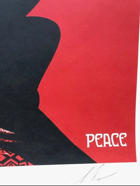 A beautiful offset lithograph by Shepard Fairey. Signed in pencil lower right. Open edition. The lithograph is in mint condition and is printed on cream speckletone thick paper. In perfect condition and very large size