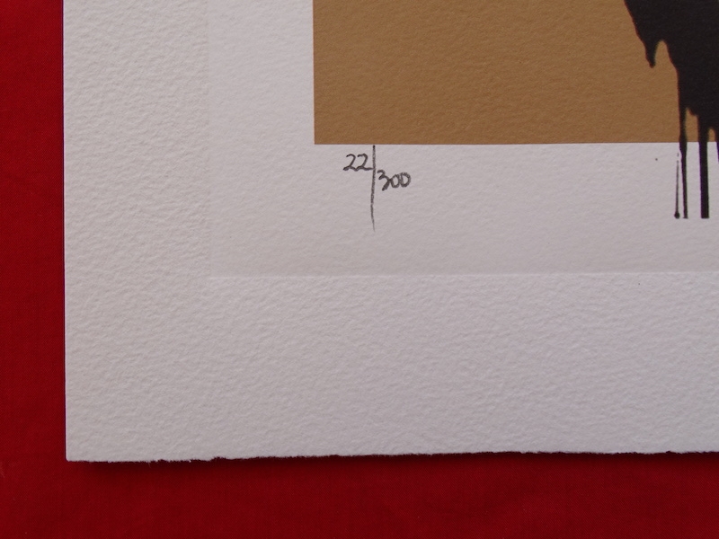 Banksy. Limited edition print reproduction, 38x28cm, Certificate of Authenticity by Certified Arts Edition Impression Ars Longa Vita Brevis Banksy is a pseudonymous England-based street artist, political activist and film director whose real name and identity remain unconfirmed and the subject of speculation. Active since the 1990s, his satirical street art and subversive epigrams combine dark humour with graffiti executed in a distinctive stenciling technique. His works of political and social commentary have appeared on streets, walls and bridges throughout the world. Banksy's work grew out of the Bristol underground scene, which involved collaborations between artists and musicians.Banksy says that he was inspired by 3D, a graffiti artist and founding member of the musical group Massive Attack. Banksy displays his art on publicly visible surfaces such as walls and self-built physical prop pieces. Banksy no longer sells photographs or reproductions of his street graffiti, but his public "installations" are regularly resold, often even by removing the wall they were painted on.Much of his work can be classified as temporary art. A small number of Banksy's works are officially, non-publicly, sold through an agency created by Banksy named Pest Control. Banksy's documentary film Exit Through the Gift Shop (2010) made its debut at the 2010 Sundance Film Festival.In January 2011, he was nominated for the Academy Award for Best Documentary Feature for the film. In 2014, he was awarded Person of the Year at the 2014 Webby Awards.