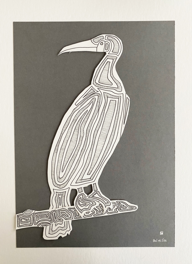 For these works I started from a self-made photo of a cormorant that looked quite mysterious; only the silhouette and a few small details were visible. Recently I saw a documentary about how birds see each other. They apparently see more colors than humans. That is the starting point of the submitted works. The multicolored work is my interpretation of how other birds would see this cormorant, the gray work how we see the cormorant. The other 2 are artistic own interpretations. Intro artist: On @saartjes_art Instagram you will notice that there are mainly bird illustrations, but not just birds. They are birds that appeared in front of my lens, birds that I enjoyed looking for and photographing again and again. Starting from the photos taken, I make drawings in which I try to reflect the atmosphere of the moment and the character of the bird.