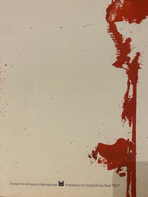 Beautiful rare lithograph by Arman. Print signed. This lithograph was made for Amnesty International in 1977. The work is in perfect condition and measures a total of 75 x 51 cm 2 color lithograph with black and red.