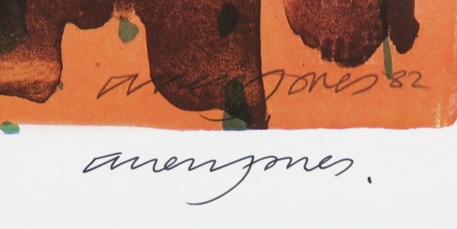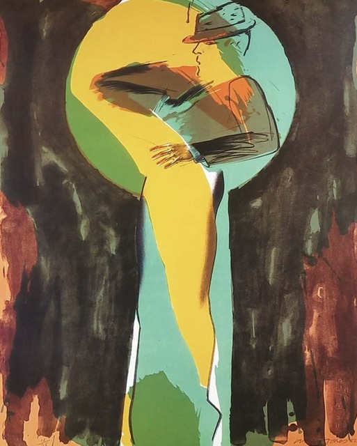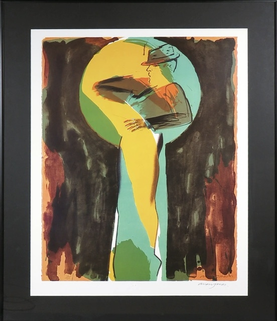 Depiction with a keyhole through which a man with a hat can be seen. The work is both in print and hand signed on the right. This image was also used for an exhibition poster of Galerie Kammer in Hamburg.