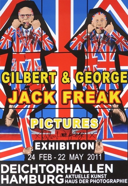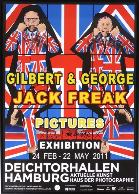 Signed poster issued on the occasion of the exhibition Jack Freak Pictures in the Deichtorhallen, Hamburg. The work is signed with marker by both artists. Gilbert Prousch (San Martin de Rot, 1943) and George Passmore (Plymouth, 1942) decided to go into art together when they met at St Martins School of Art. In their art they often process themselves, following the idea that a sacrifice and personal investment is needed for making art. The duo has been making art for almost 50 years now inspired by their residential area of the East End of London. They are big names in performance art, video art and conceptual art.