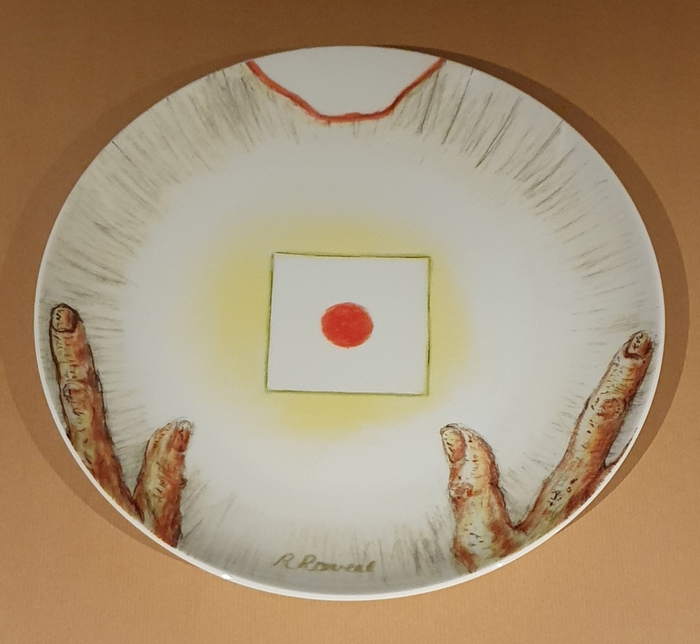 Color screen printing on fired porcelain. Diameter 295 mm. The work was published in 500 copies. The first hundred were numbered. This is an unnumbered copy. Publisher: Luc Levrau. The work is described in the graphic oeuvre under number M11 on page 227.