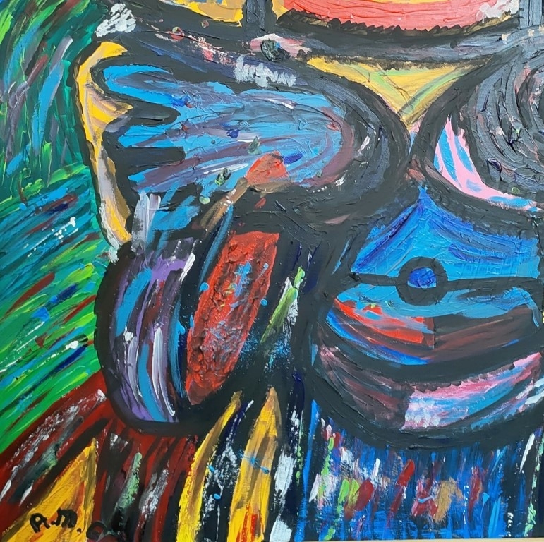 A.M.G, here with his work, executed in the cobra style, which is done with acrylic paint and the right color palette, LOVE is in the air!, that will probably become the style in the near future!