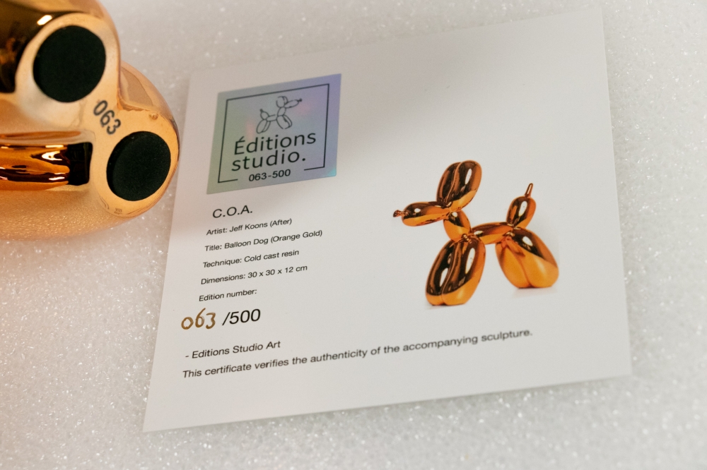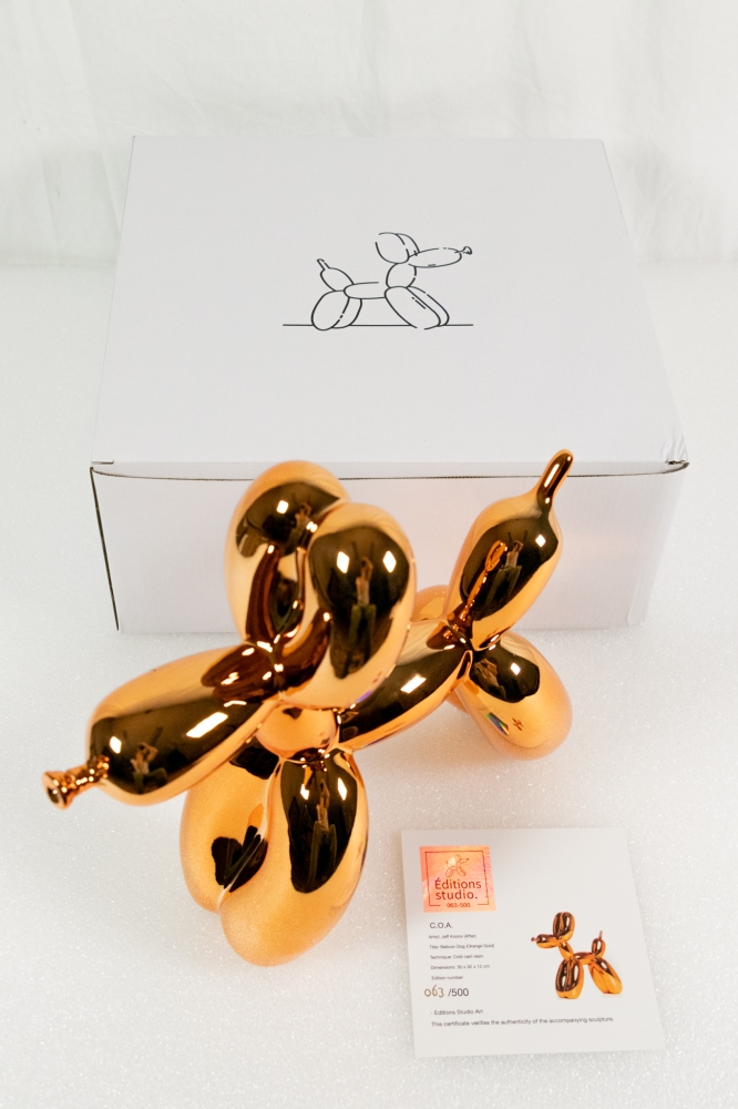 Resin sculpture after Jeff Koons, published by Éditions Studio. Edition limited to 500 pieces. The sculpture comes with the original packaging and is accompanied by the original certificate. Sculpture is in good to excellent condition.