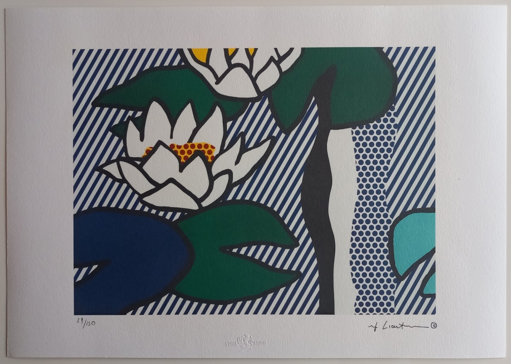 Lithograph after the original 'Les Nymphéas' from 1993. Signed in the plate and numbered in limited edition 29/150. Styria Studio relief stamp and Castelli Graphics NY stamp on the back. Les Nymphéas comes from a group of works that make up Lichtenstein's 'Water Lilies' series, a tribute to the water lily paintings of Impressionist artist Claude Monet. These innovative works were originally partly made on stainless steel and seem to be reflected like water.