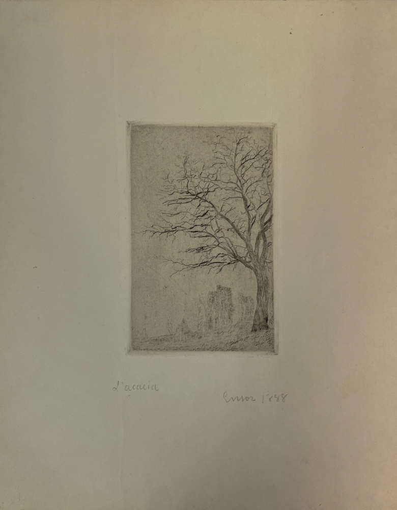 Ets van James Ensor, getekend en getiteld onderaan in potlood. Het werk is opgenomen in het boek van Aug Tavernier onder het nummer 24 op pagina 75. Het werk is niet ingelijst. Acacia is een geslacht van planten uit de onderfamilie Mimosoideae van de vlinderbloemenfamilie (Leguminosae/Fabaceae). Het werk bevat twee verticale kreuken.