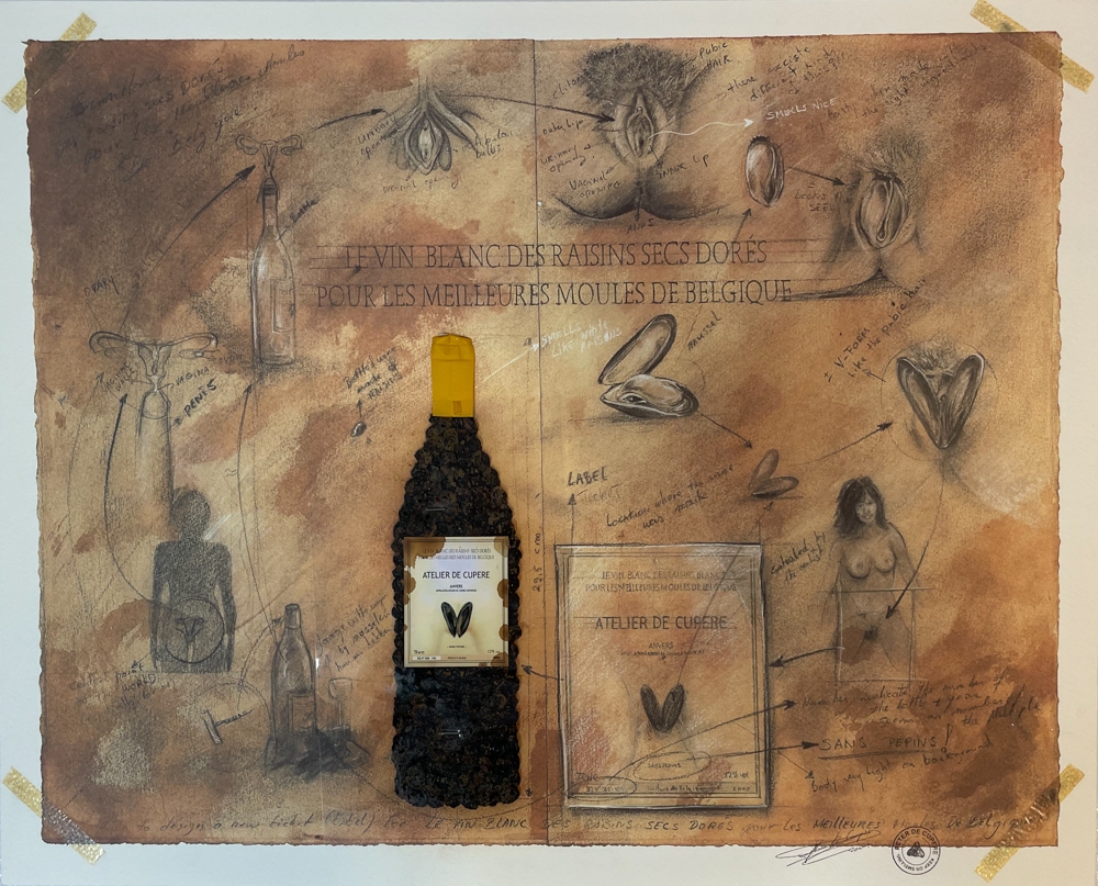 Atelier De Cupere (Peter De Cupere, 1970), 'Le vin blanc des raisins secs', mixed media, 50 x 63,5 cm. Het werk werd met de hand gesigneerd door Peter De Cupere. Het werk is een collage waarbij echte gedroogde rozijen