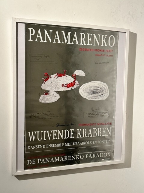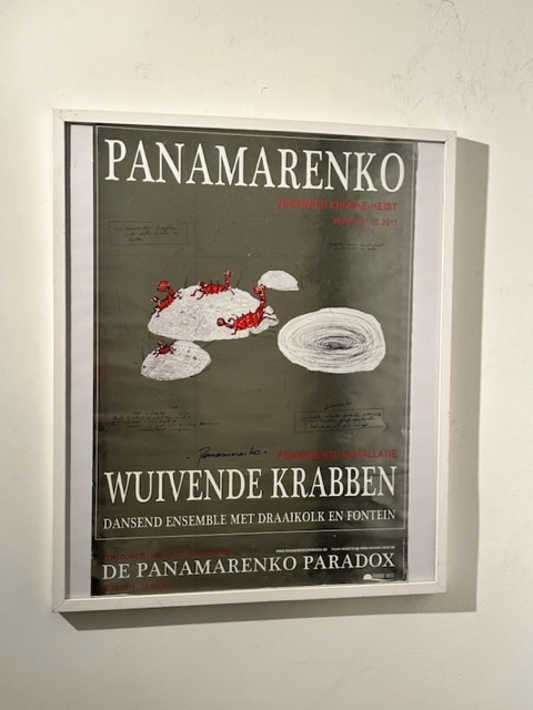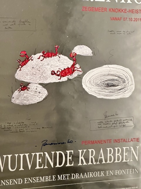 Zeldzame gesigneerde tentoonstellingsaffiche Wuivende Krabben. Met de hand gesigneerd door Panamarenko. Panamarenko, de artiestennaam van Henri Van Herwegen was een Belgisch beeldhouwer. Hij wordt beschouwd als een van de voornaamste Belgische beeldhouwers uit de tweede helft van de 20e eeuw. Hij maakte veel assemblages die met vliegen te maken hebben.