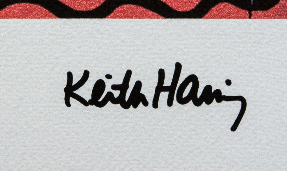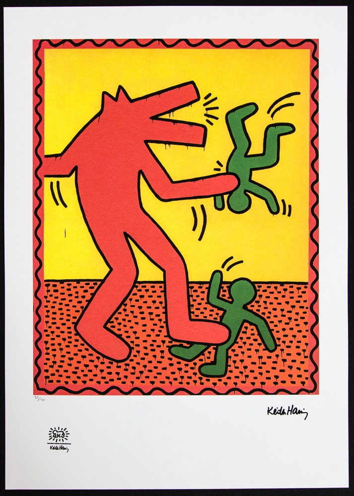 Keith Haring (after) untitled, offset lithography, limited edition of 150, sheet size 50 x 70 cm, plate signed bottom right, numbered with pencil bottom left 99/150, cotton paper, Keith Haring Foundation stamp and embossing bottom left, without additional documentation, sold unframed; we offer in-house shipping, if the buyer win multiple items, we will combine shipping