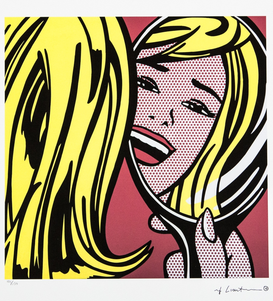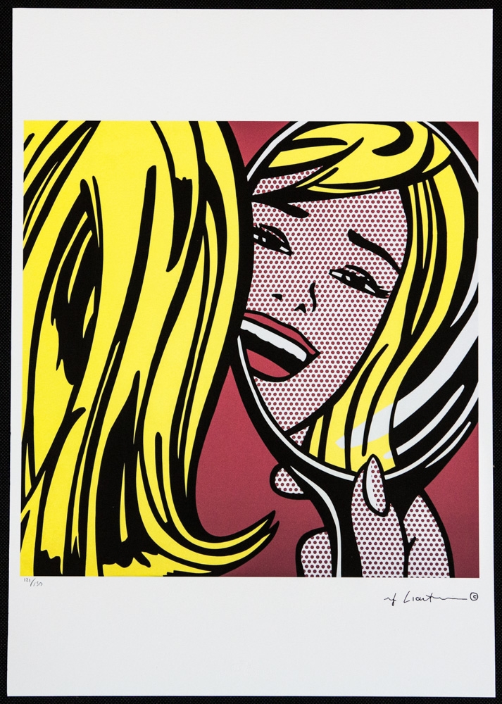 Roy Lichtenstein (after) "Girl In Mirror" limited edition of 150, offset lithography, plate signed bottom right, numbered with pencil bottom left 121/150, heavy paper, with "STYRIA Studio" embossing,"CASTELLI Graphics" stamp on the back, sheet size 35 x 50cm, without additional documentation, sold unframed; we offer in-house shipping, if the buyer win multiple items, we will combine shipping