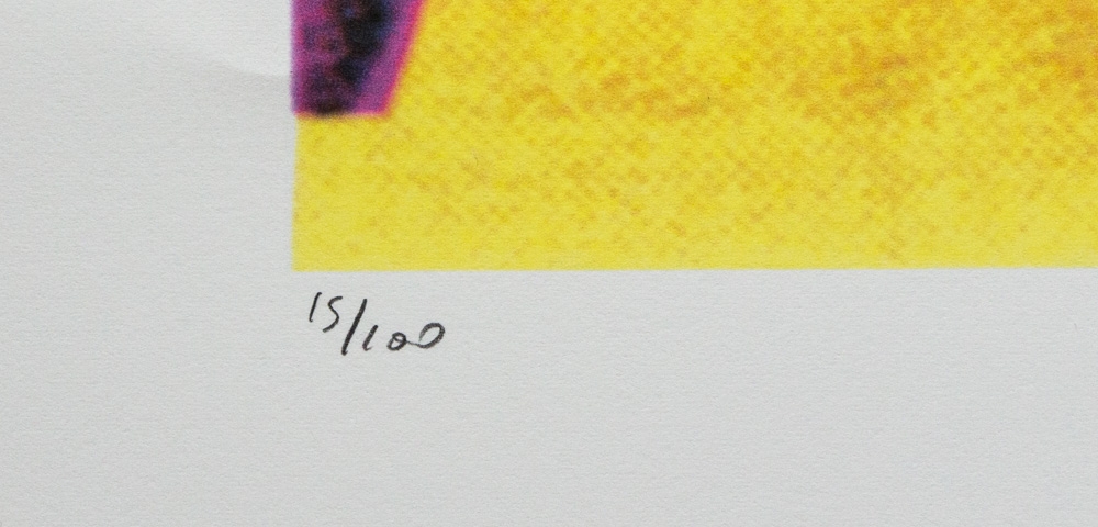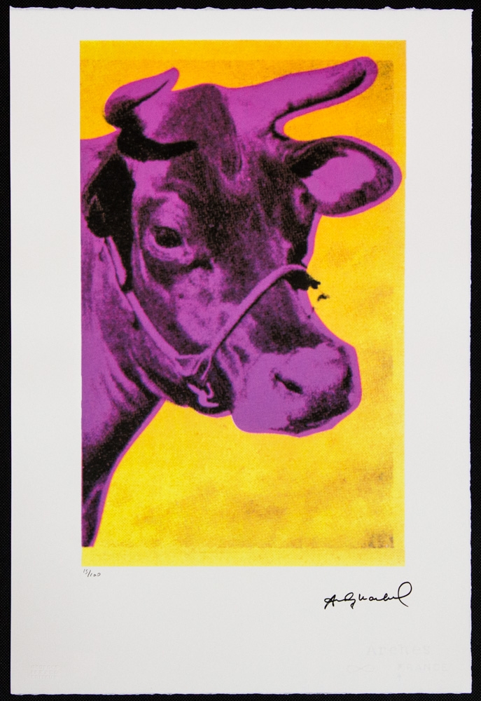 Andy Warhol (after) „Cow" offset lithograph in colors on Arches paper, Georges Israel Editeur, sheet size 38,5 x 57 cm, plate signed bottom right, numbered with pencil, limited edition 15/100 (Leo Castelli, Art Gallery New York and Tree of Life stamps on the back), without additional documentation, sold unframed; we offer in-house shipping, if the buyer win multiple items, we will combine shipping