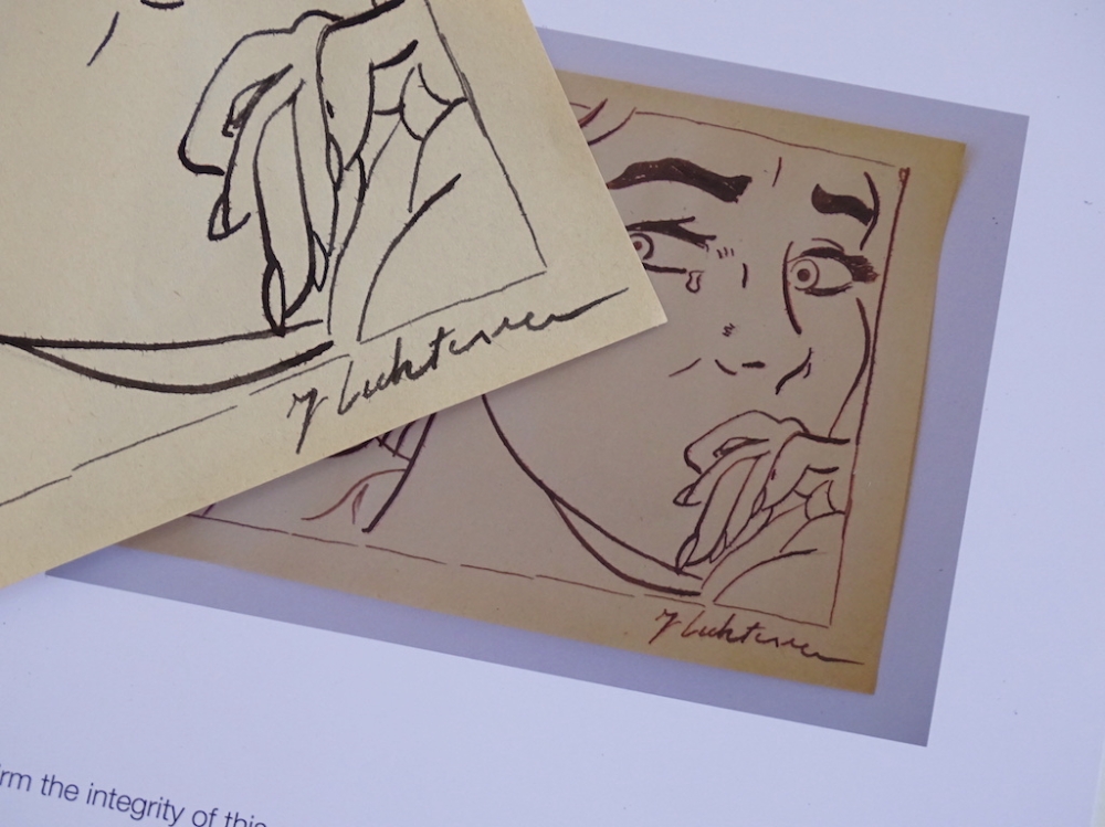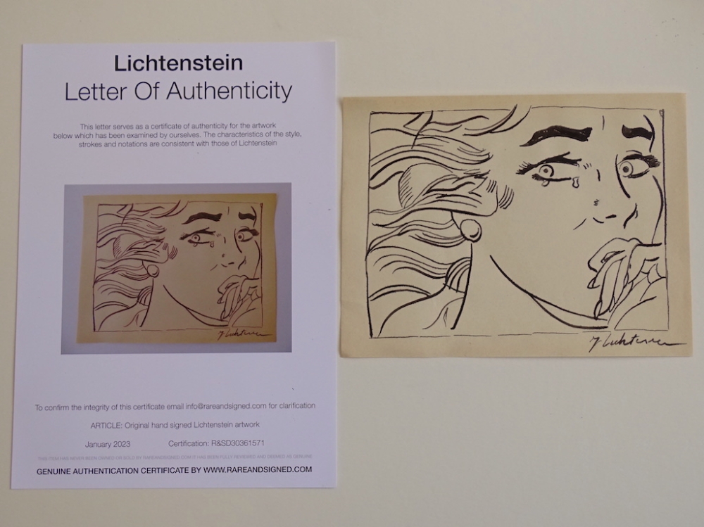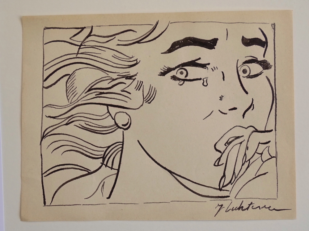 Roy Lichtenstein (attributed) ink drawing,ca 24x17cm Roy Fox Lichtensteinwas an American pop artist. During the 1960s, along with Andy Warhol, Jasper Johns, and James Rosenquist among others, he became a leading figure in the new art movement. His work defined the premise of pop art through parody. Inspired by the comic strip, Lichtenstein produced precise compositions that documented while they parodied, often in a tongue-in-cheek manner. His work was influenced by popular advertising and the comic book style. His artwork was considered to be "disruptive". He described pop art as "not 'American' painting but actually industrial painting". His paintings were exhibited at the Leo Castelli Gallery in New York City.