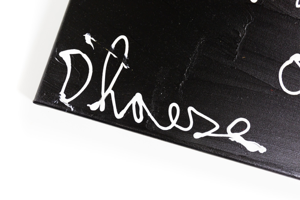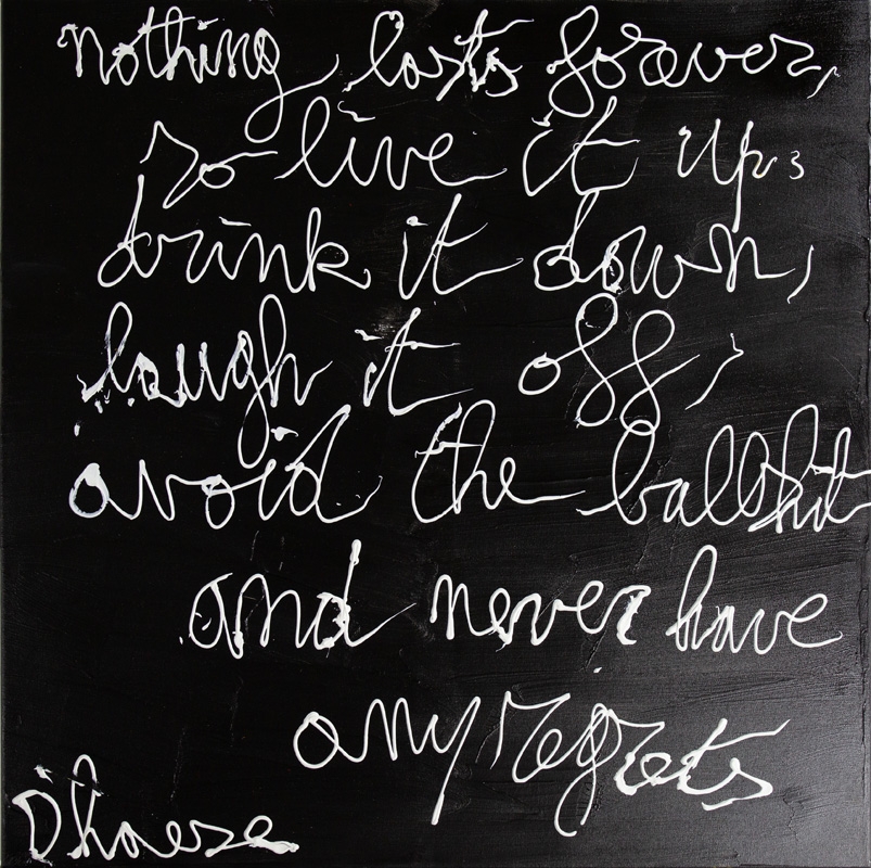 A painting from Hannes D'Haese with one of his recurring spells : "Nothing lasts forever, so live it up, drink it down, laugh it off, avoid the bullshit and never have any regrets"