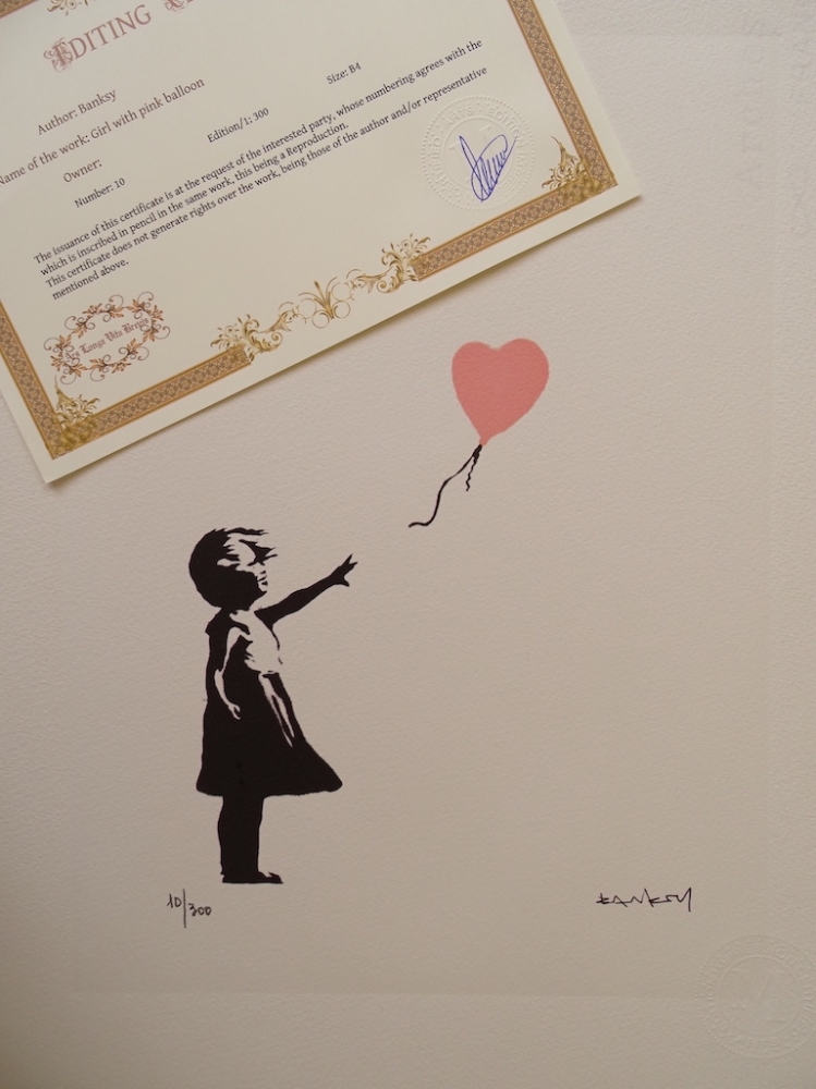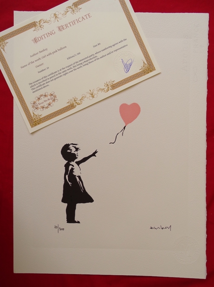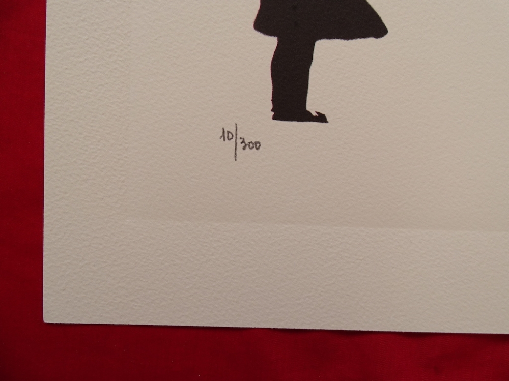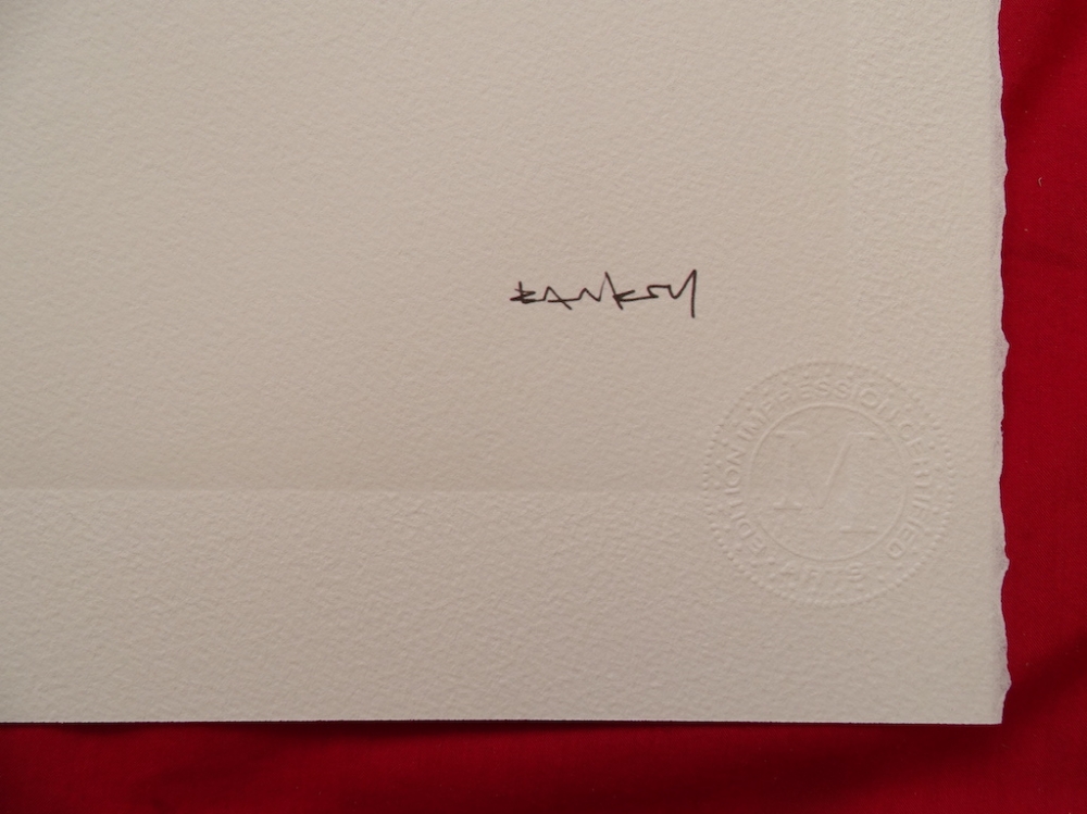 Banksy. Limited edition print reproduction, 38x28cm, Certificate of Authenticity by Certified Arts Edition Impression Ars Longa Vita Brevis Banksy is a pseudonymous England-based street artist, political activist and film director whose real name and identity remain unconfirmed and the subject of speculation. Active since the 1990s, his satirical street art and subversive epigrams combine dark humour with graffiti executed in a distinctive stenciling technique. His works of political and social commentary have appeared on streets, walls and bridges throughout the world. Banksy's work grew out of the Bristol underground scene, which involved collaborations between artists and musicians.Banksy says that he was inspired by 3D, a graffiti artist and founding member of the musical group Massive Attack. Banksy displays his art on publicly visible surfaces such as walls and self-built physical prop pieces. Banksy no longer sells photographs or reproductions of his street graffiti, but his public "installations" are regularly resold, often even by removing the wall they were painted on.Much of his work can be classified as temporary art. A small number of Banksy's works are officially, non-publicly, sold through an agency created by Banksy named Pest Control. Banksy's documentary film Exit Through the Gift Shop (2010) made its debut at the 2010 Sundance Film Festival.In January 2011, he was nominated for the Academy Award for Best Documentary Feature for the film. In 2014, he was awarded Person of the Year at the 2014 Webby Awards.