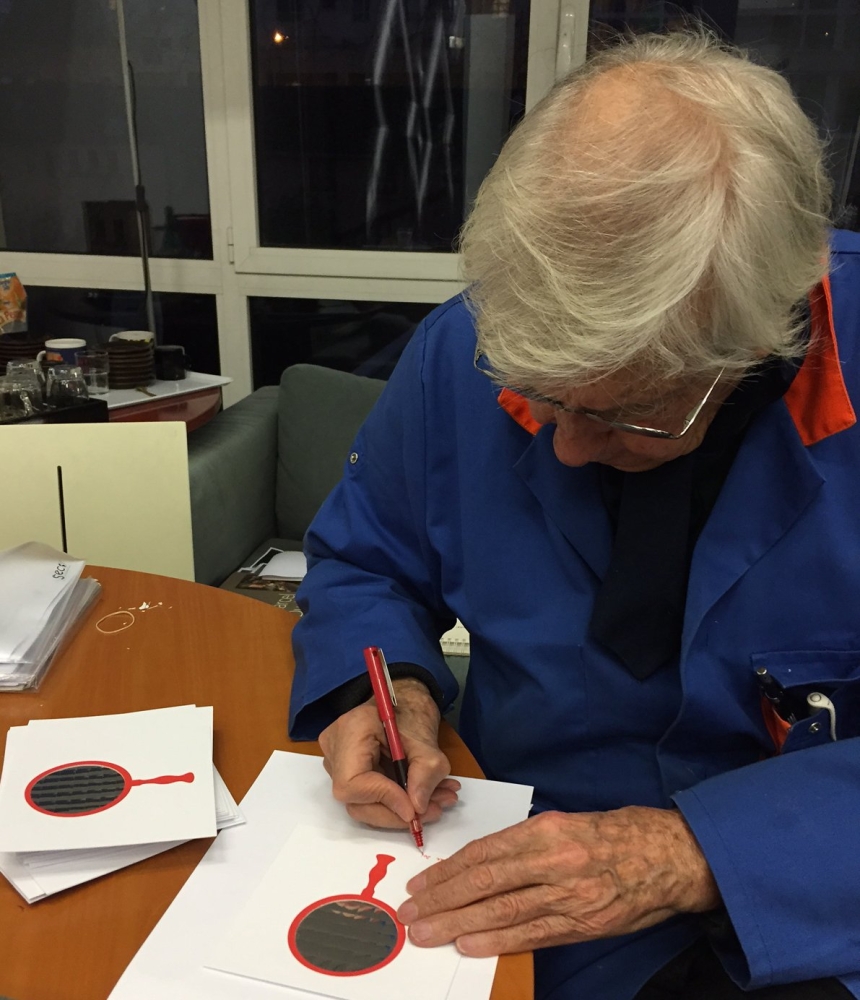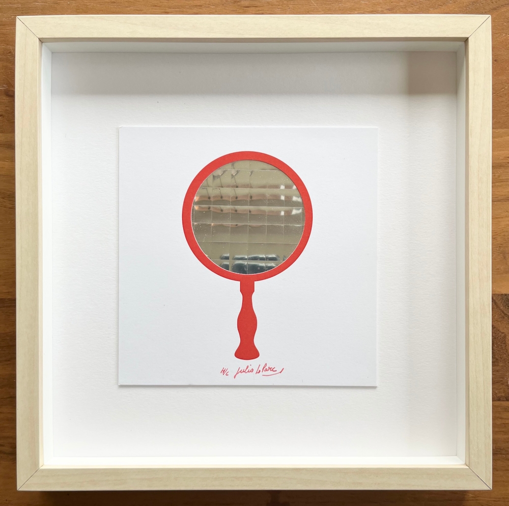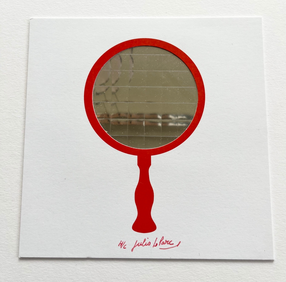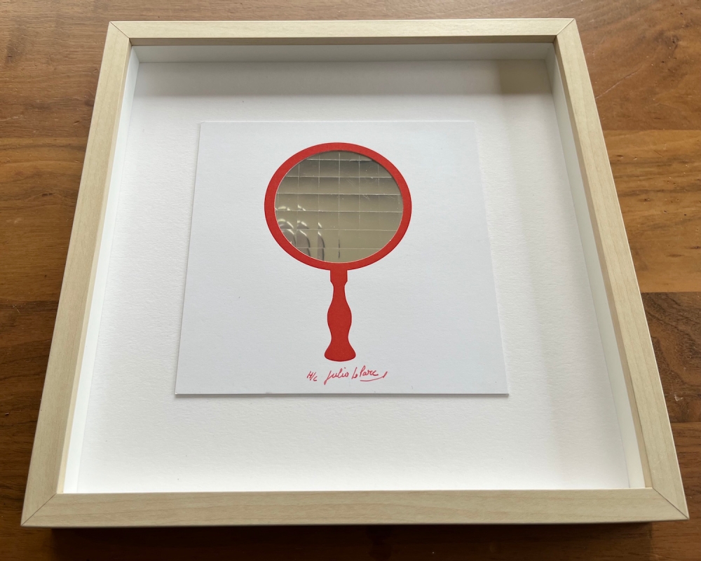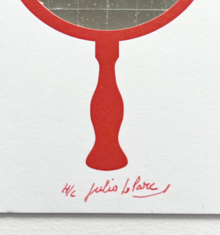 I am selling a collage Julio Le Parc. The piece is called "Mirror". It is a collage with a mirrored foil inside a card. Handsigned in marker by Julio Le Parc. Numbered H/C (hors commerce). The regular edition is 100 pieces. Enclosed you can see a picture of Julio Le Parc signing the pieces. He made these kind of artpieces in the 60's. This is a more recent edition piece. Dimensions: 14.3 x 14.3 cm, 25 x 25 cm x 3cm (frame) The piece and frame are in perfect condition.