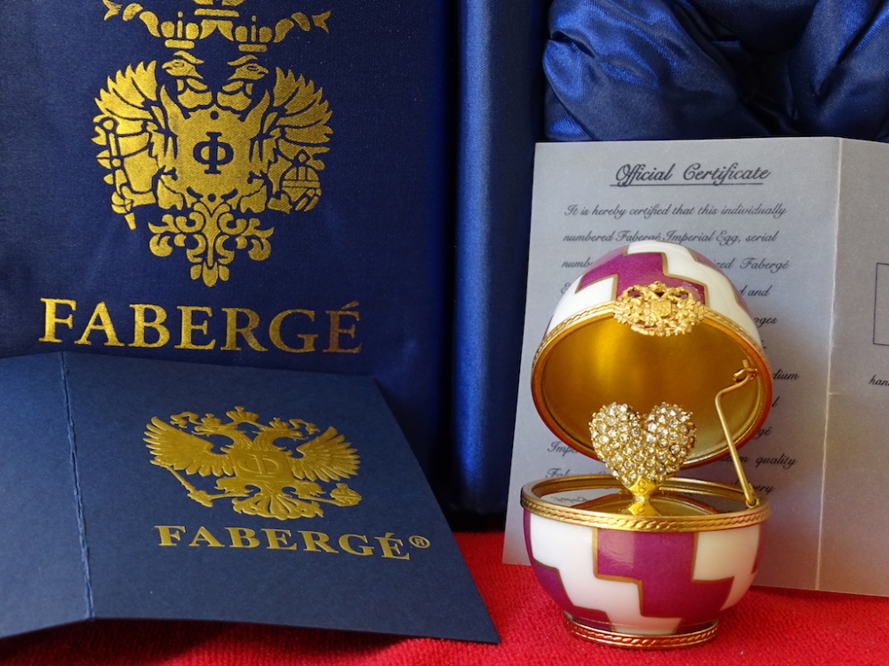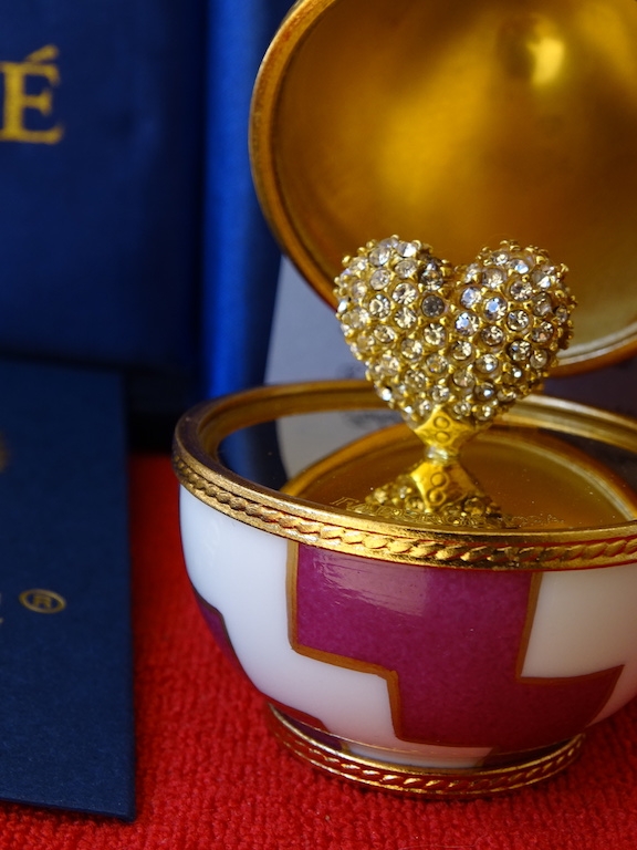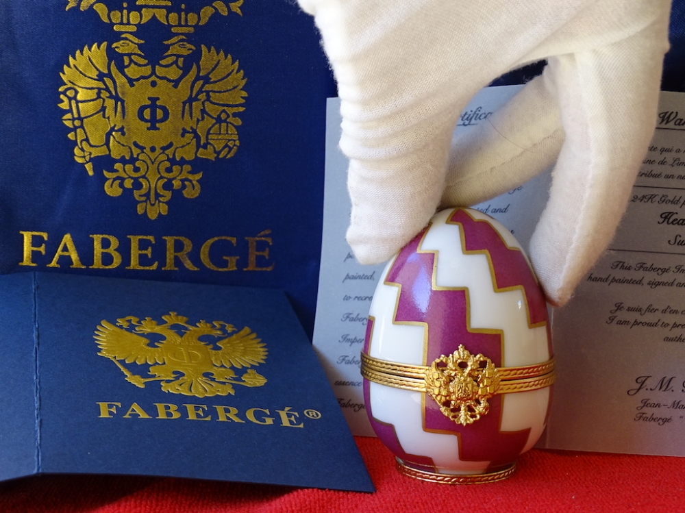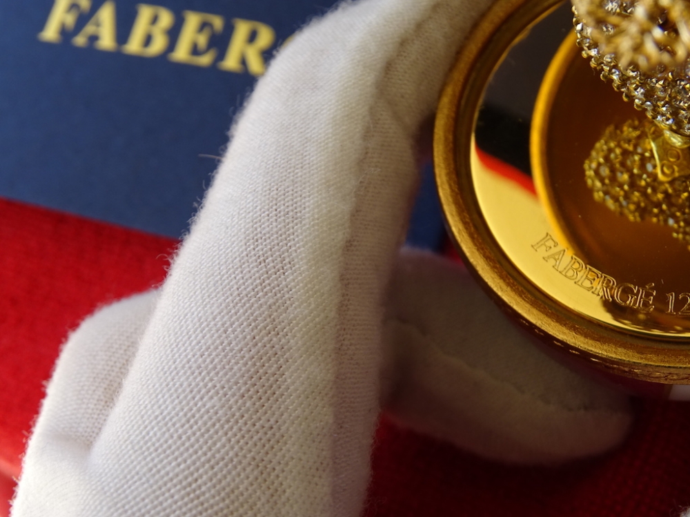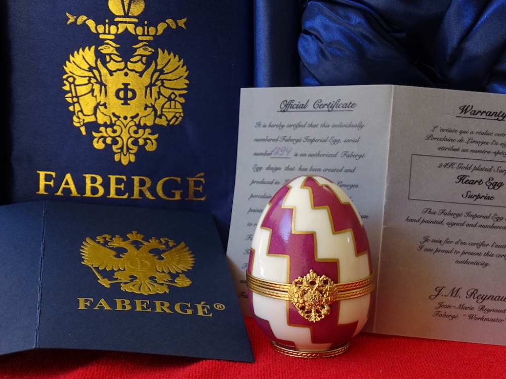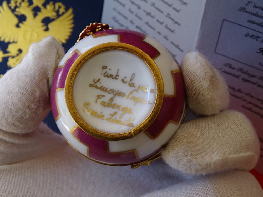 Imperial Egg - 24 carat gold finished Original box included 24k gold plated, limoges fine porcelain This egg was created exclusively by the House of Faberge. This is an object that is highly quoted on the art market. Egg with a very beautiful shine. The set is in great condition, excellent. See the many pictures to get a good idea about all the details and the superb artwork on this egg.